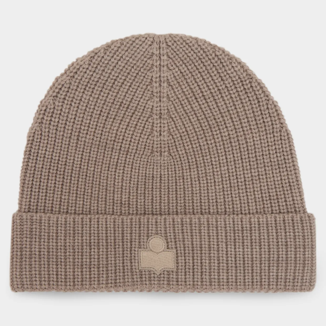 - Rib knit structure, beanie style, turned-up brim, embroidered logo badge