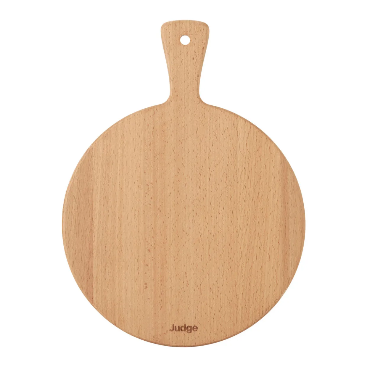 - Pizza board, solid, hard wearing, naturally antibacterial beech wood, won’t blunt knives, brand logo detail