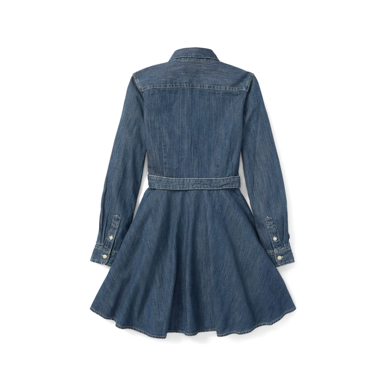 - Button-down collar, long sleeves, button placket, Polo Player logo embroidery, D-ring belt, single-button cuffs, contrast stitching, fit-and-flare silhouette, smooth denim finish