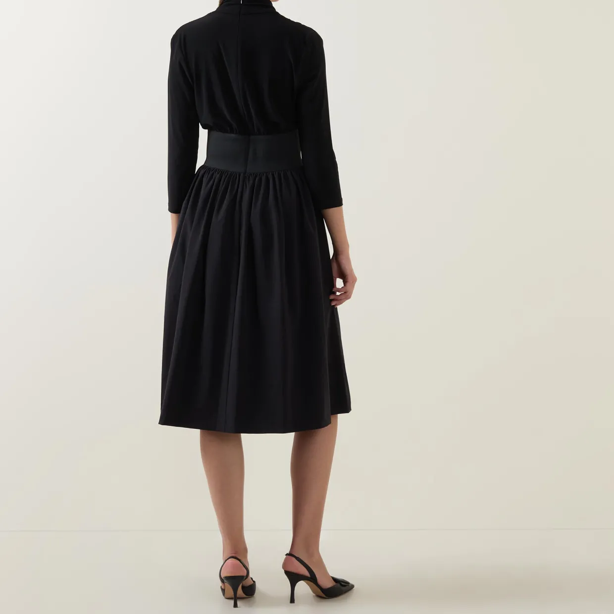 - Wrap-style bodice, V-neckline, three-quarter length sleeves, rear zip fastening, fitted through the waist, integrated belt with rear elasticated design and buckle detail, full flared skirt, straight hem, midi length, smooth finish