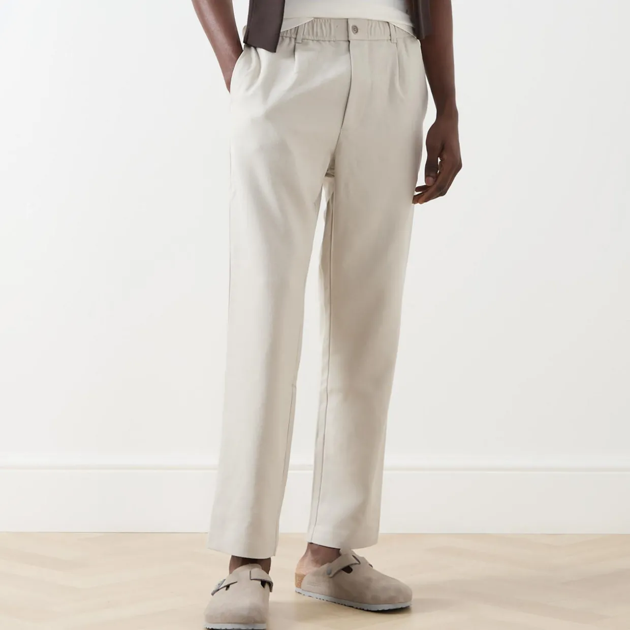 - Mid-rise, straight leg, full length, belt loops, concealed fly and button fastening, front pleats, two side entry pockets, two rear welt pockets, clean hems