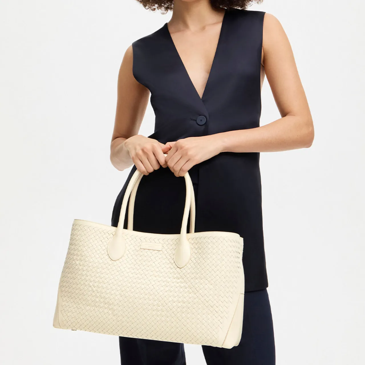 - Top handles, magnetic fastening, detachable and adjustable crossbody strap, woven design, detachable signature charms, gold-tone hardware, logo tag