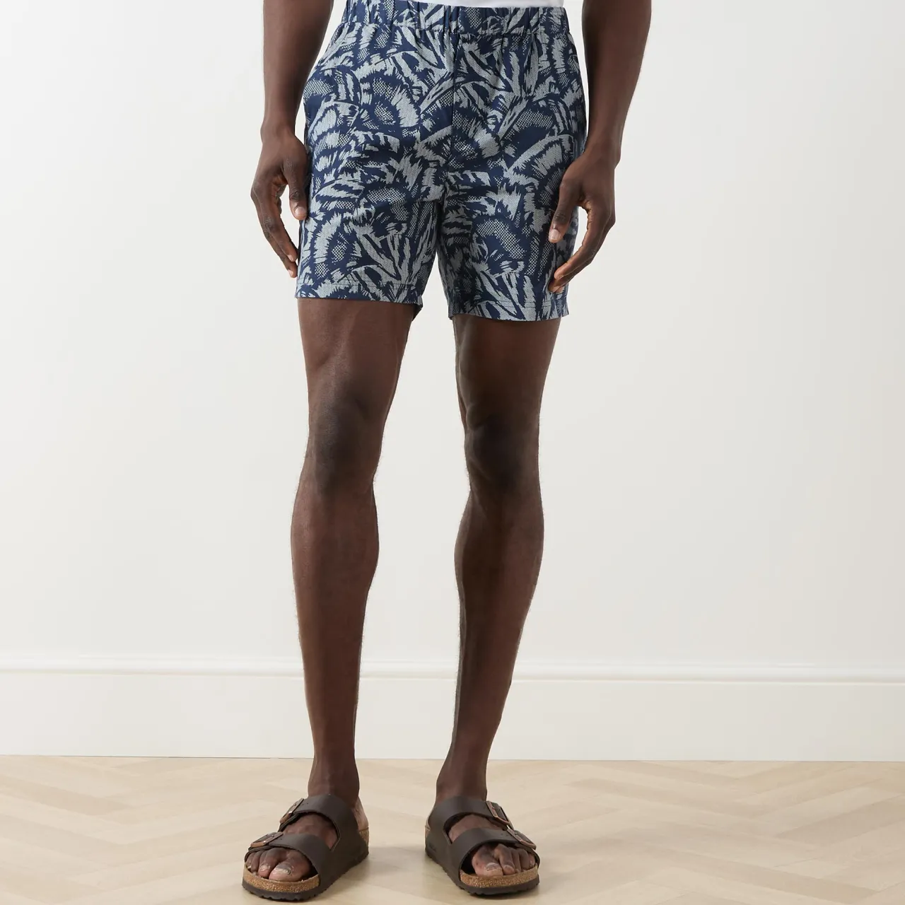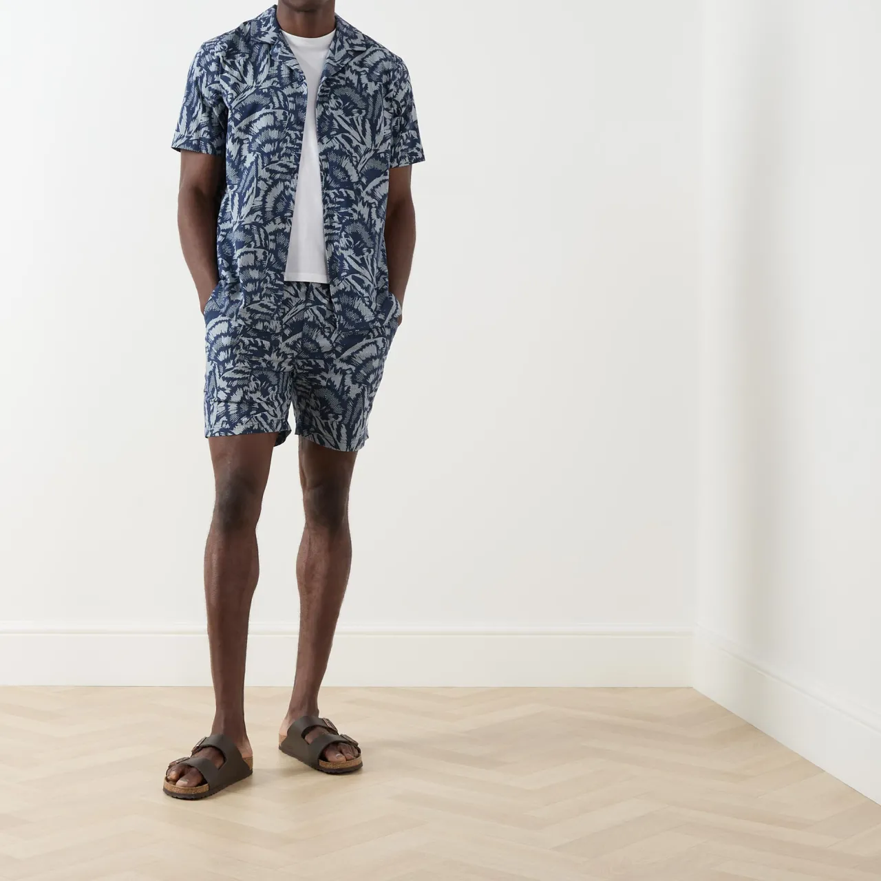 - Botanical print, seersucker texture, lightweight, side pockets, covered waistband, one back welt pocket, logo detail to hem, covered fastening
