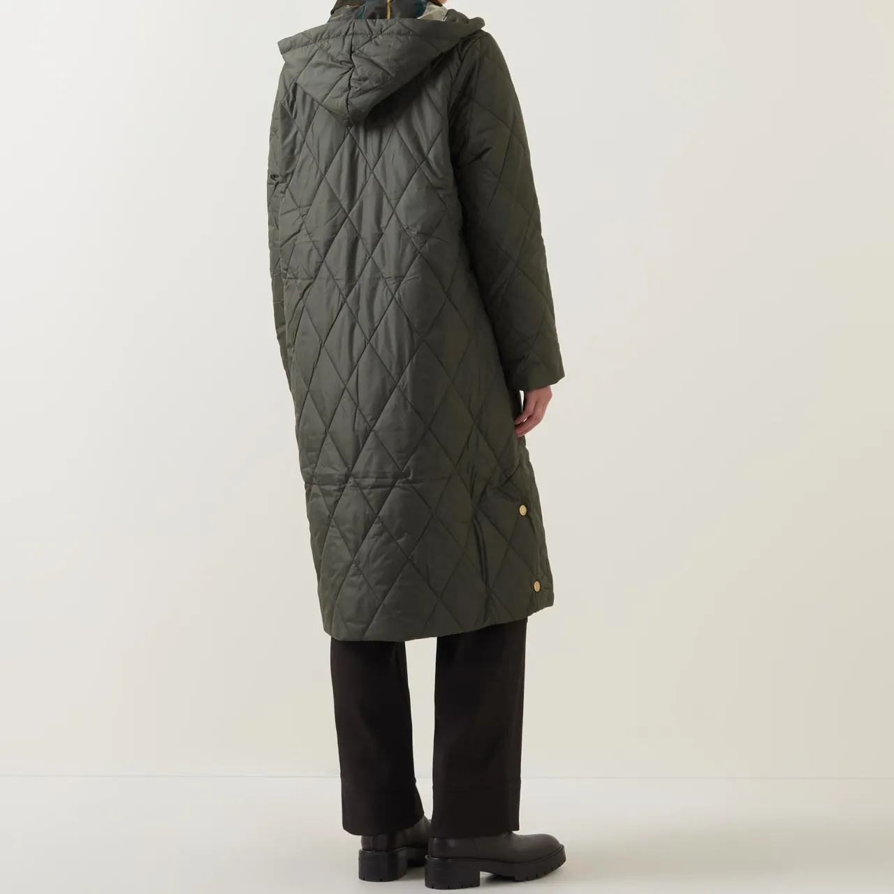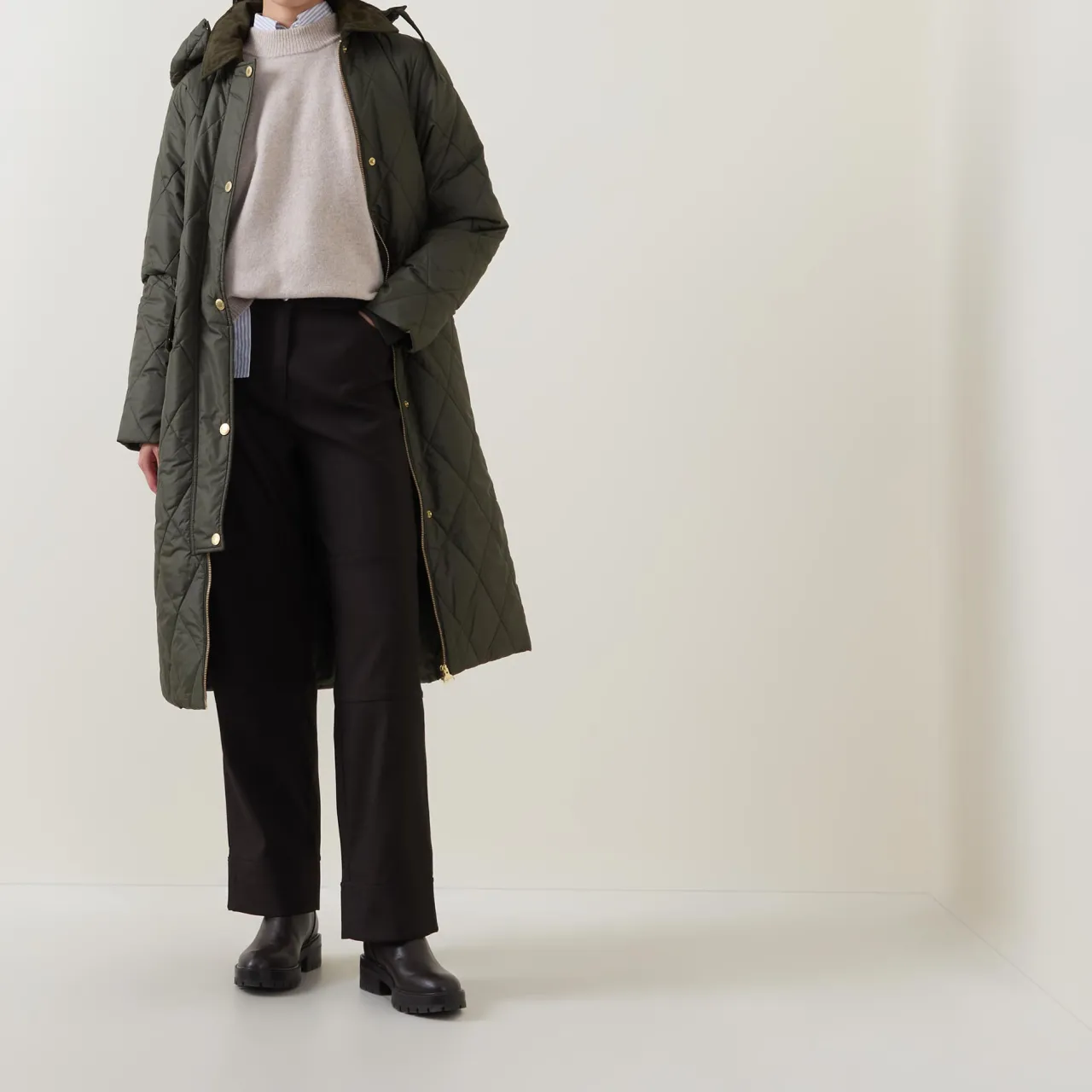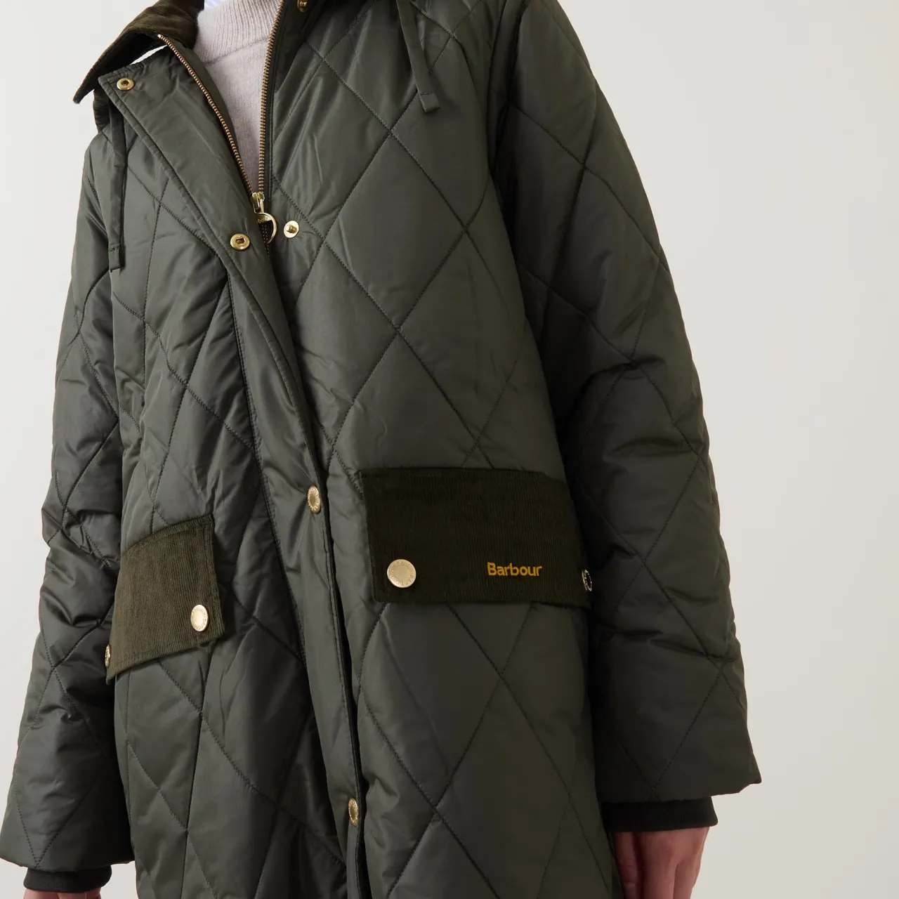 - Point corduroy collar, hood with adjustable drawstring fastening, long sleeves, two-way front zip fastening, additional snap button placket, two large flap pockets with snap button fastenings, snap button side slits, straight hem, quilted design, logo branding, mid length