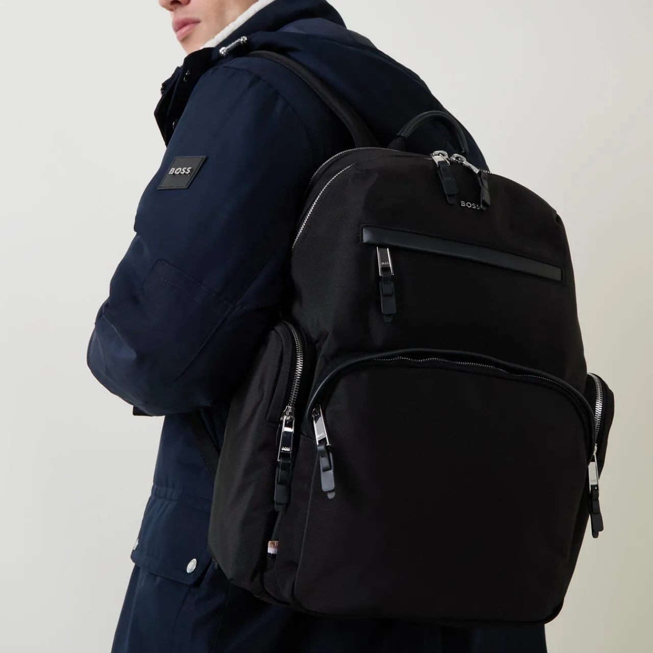 - Logo detail, top handle, internal zipped pocket, side zipped pockets, front zipped pocket