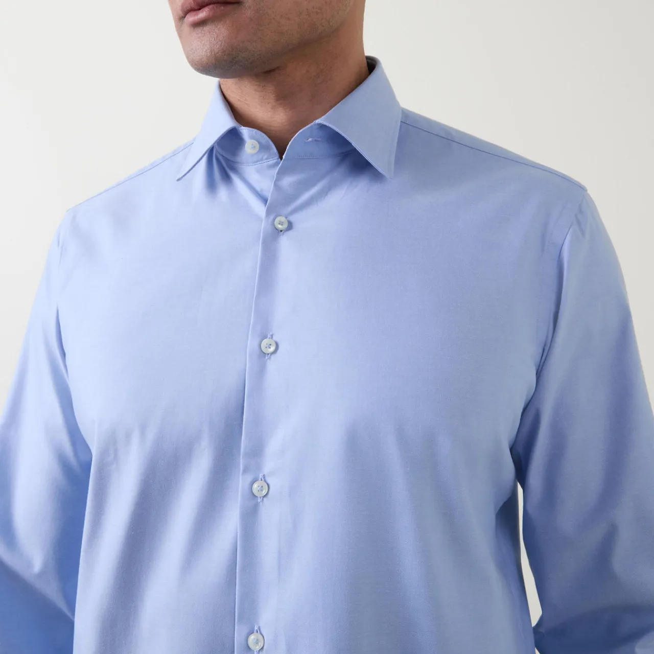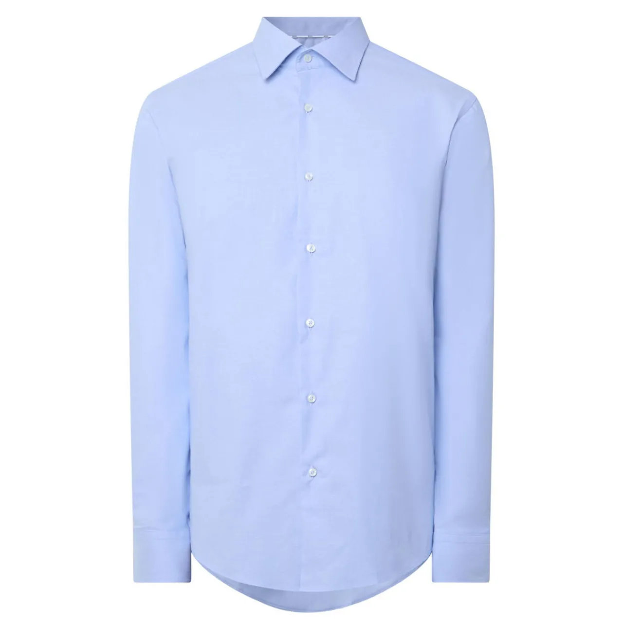 - Classic collar, button fastening, long sleeves, single cuff, curved hemline, stretch-fused fabric, easy iron