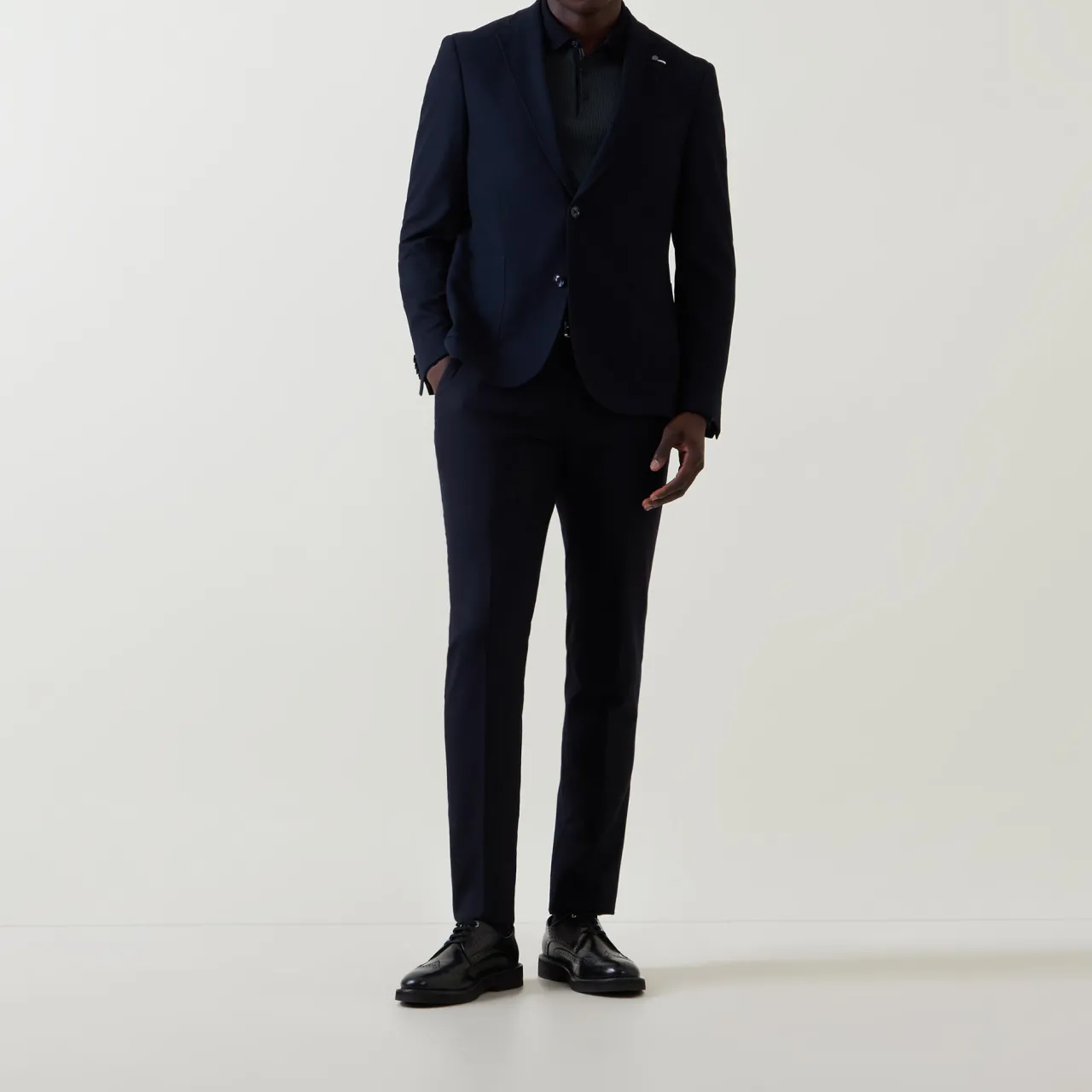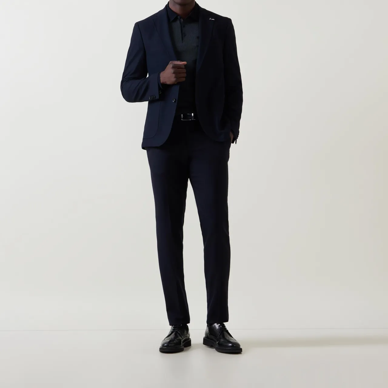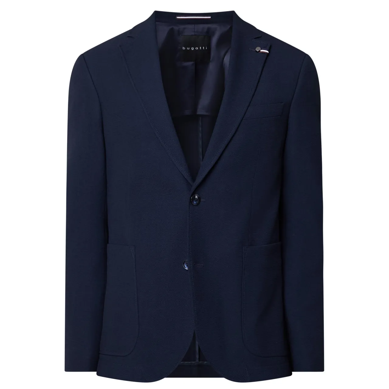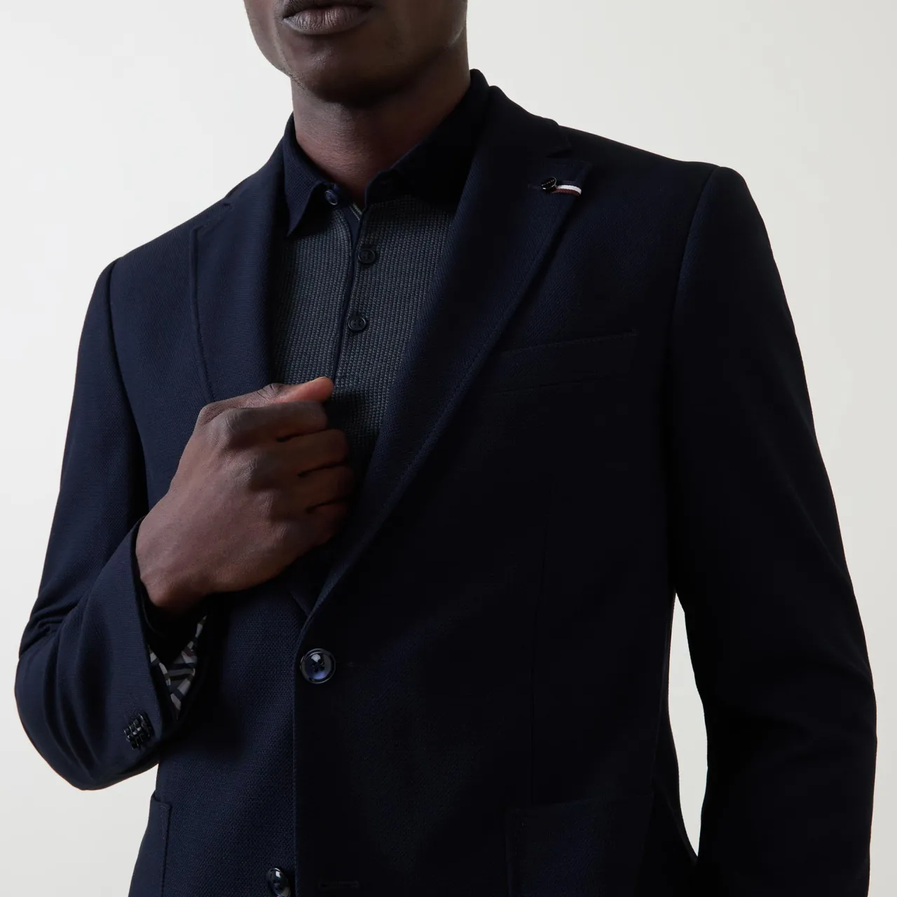 - Single-breasted front, long sleeves, notched lapel collar, button fastening, chest welt pocket, two side patch pockets, buttoned cuffs, pin detail, tonal stitching, textured finish