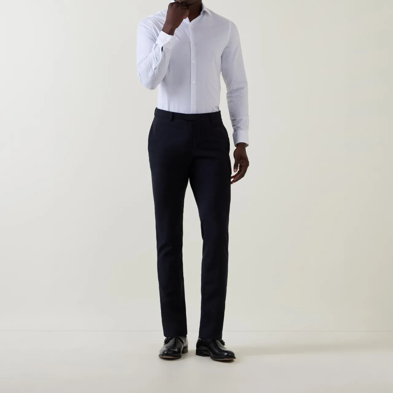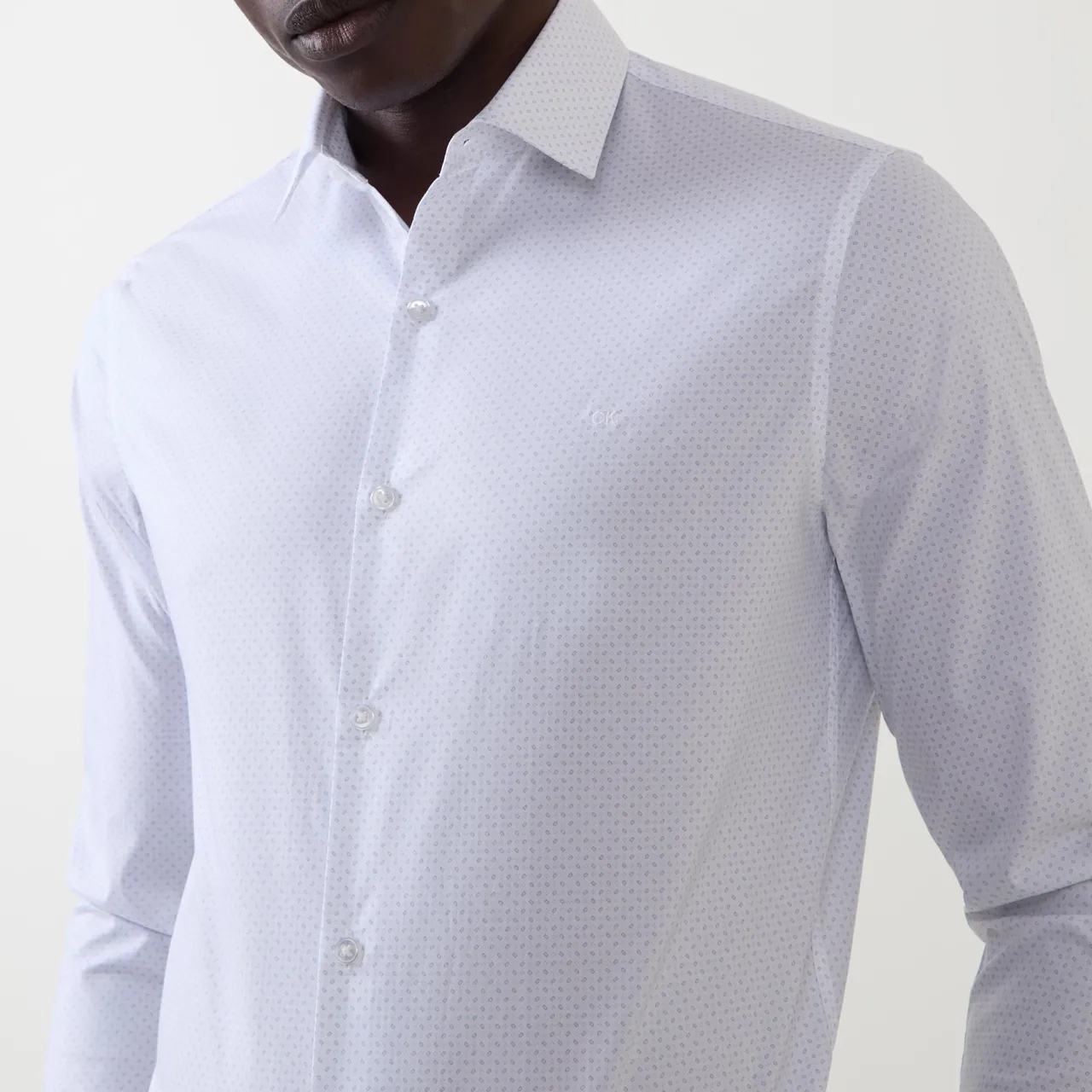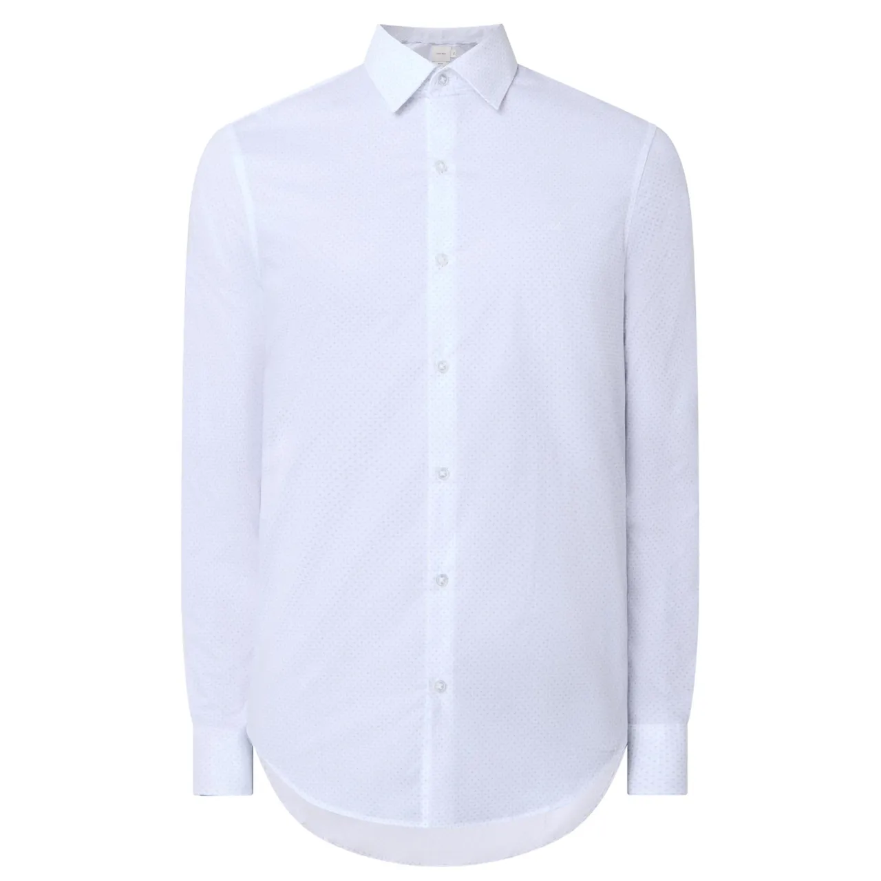 - Long sleeves, pointed collar, button fastening placket, geometric pattern, single-button cuffs, tonal stitching, curved hemline, smooth fabric