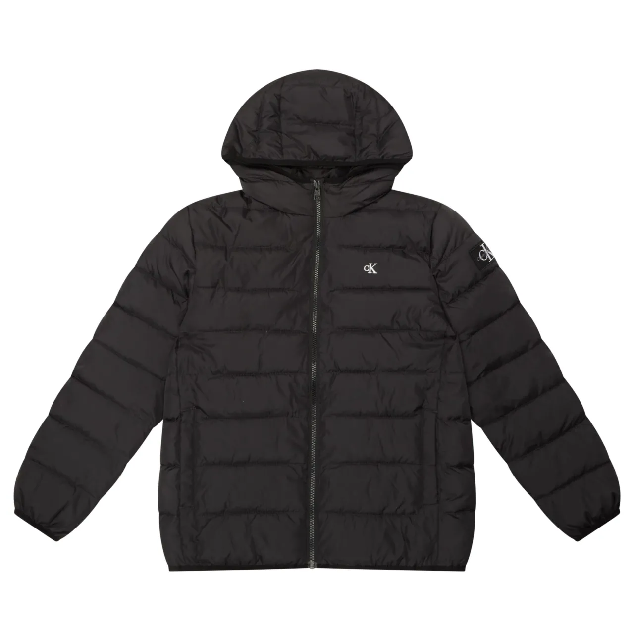 - Fixed hood, long sleeves, bound elasticated trims, front zip fastening, two vertical pockets with zip fastenings, straight hem, monogram logo detail on the chest, logo badge, quilted design, padded