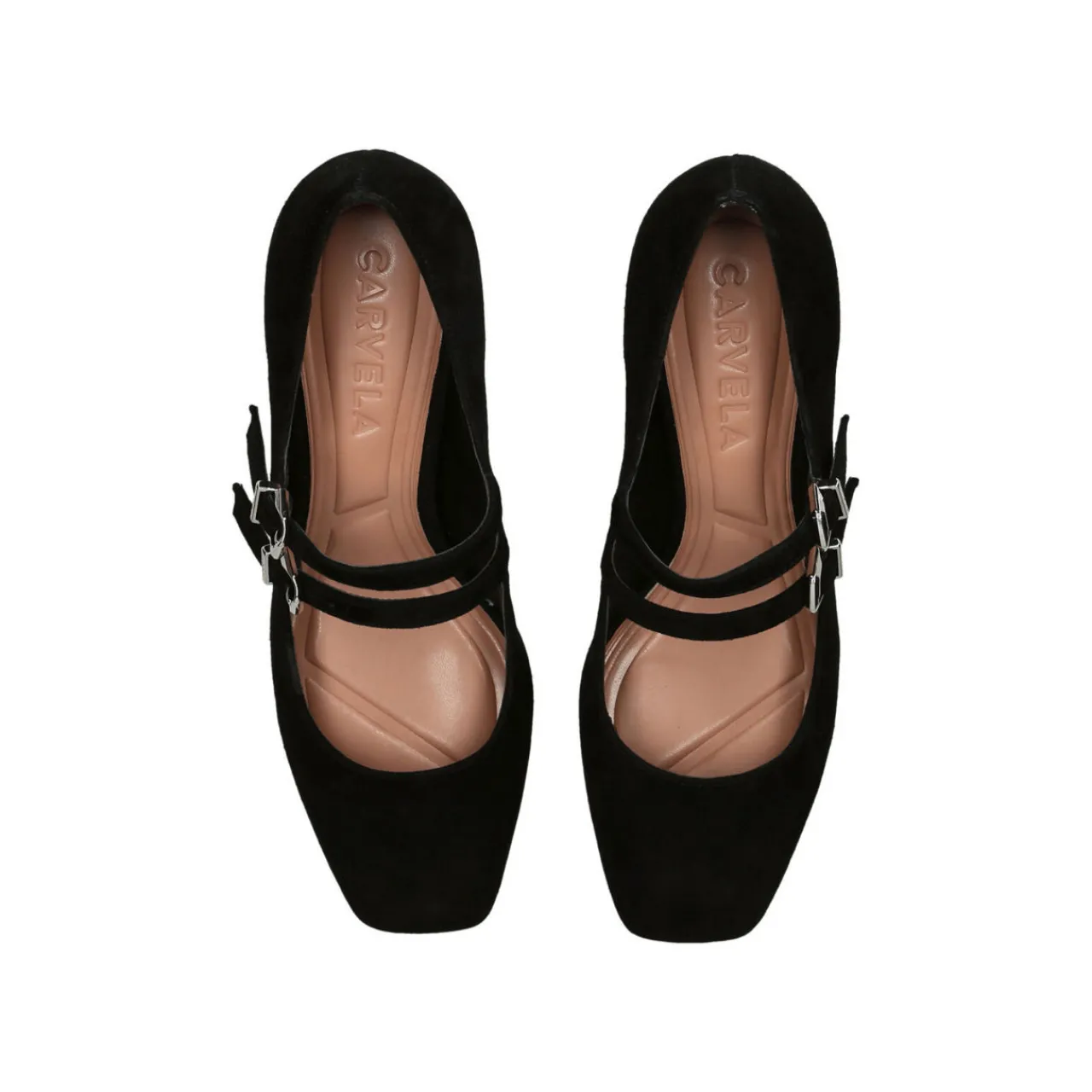 - Closed round toe, double strap design, branded buckles, block heel, buckle fastening