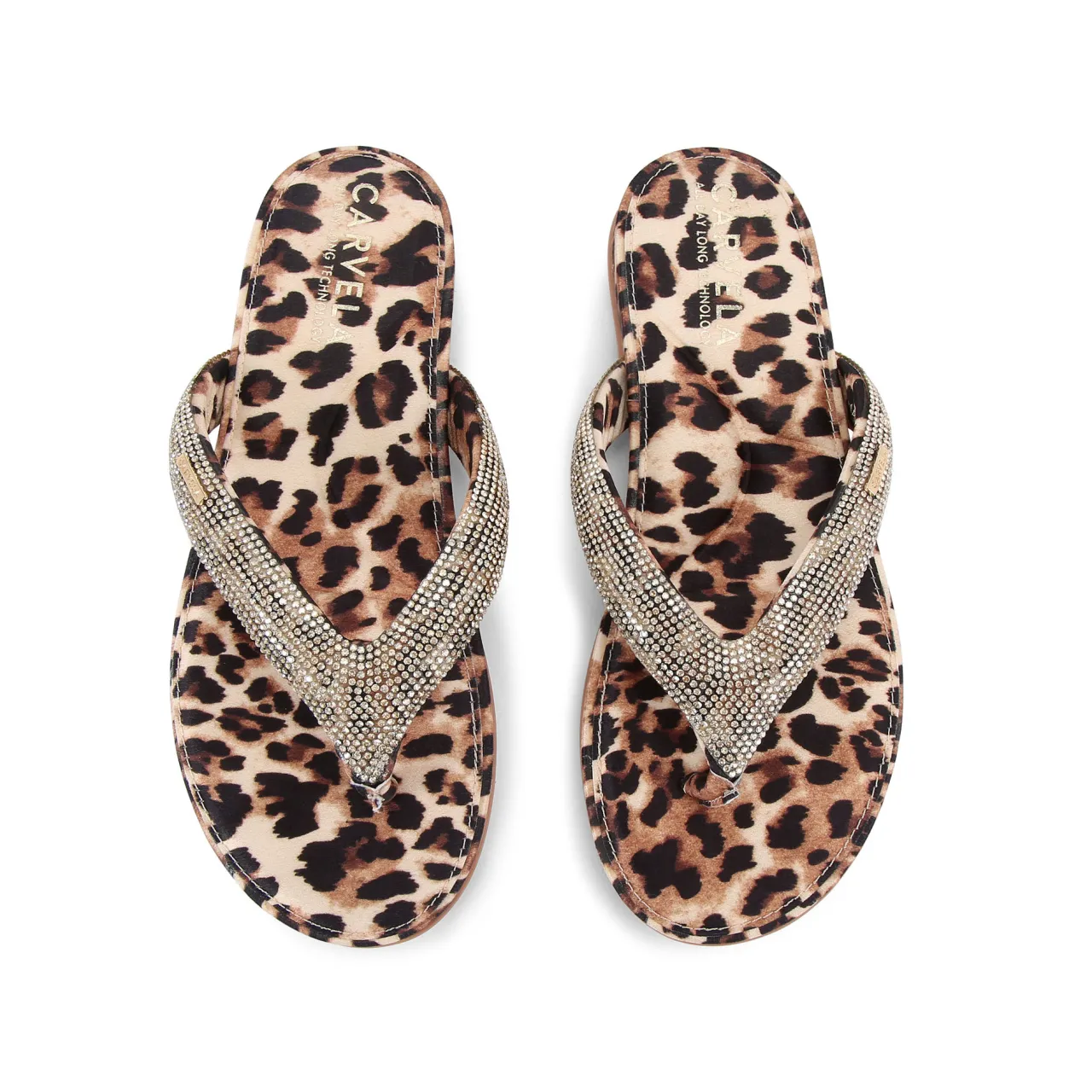- Flip-flop style, leopard printed satin footbed, crystal embellishment, T-bar toe straps, ‘All Day Long’ technology