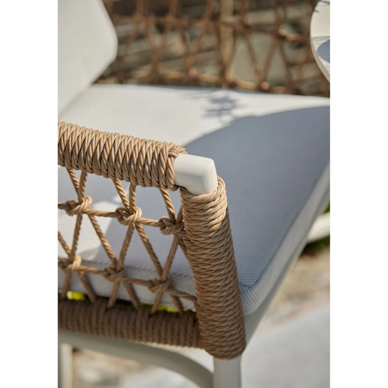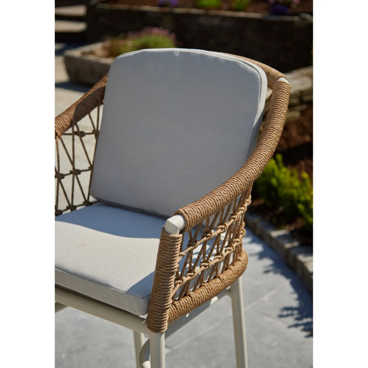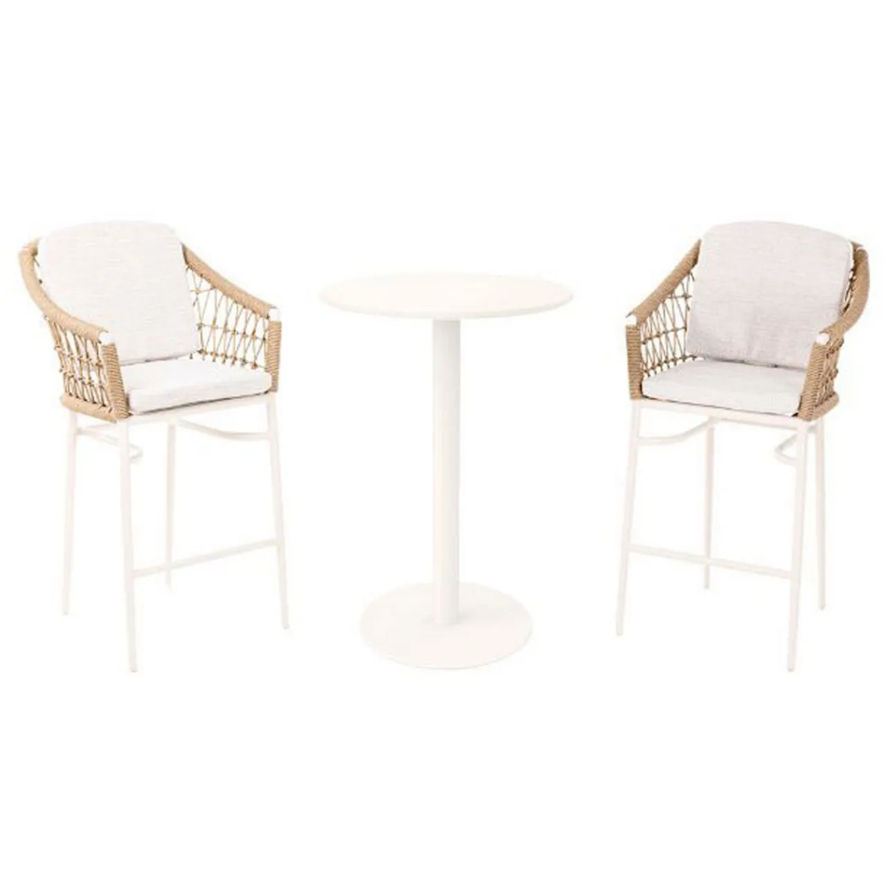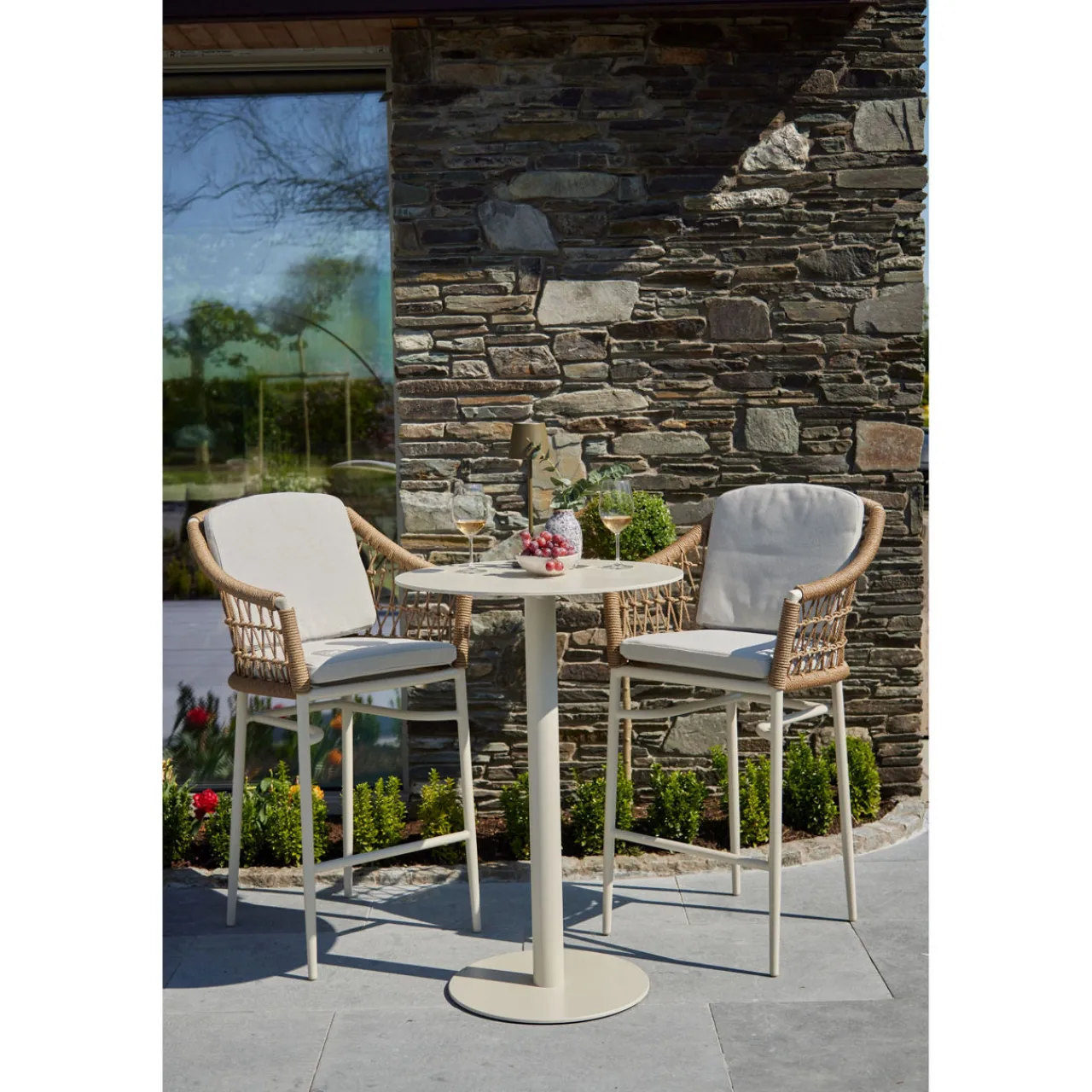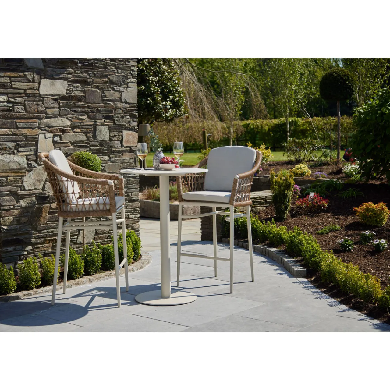 The elegant Lyon Garden Round Bar Table Set is the perfect addition to any garden. The soft colour palette creates a calming and inviting ambiance that effortlessly compliments any outdoor space. The woven texture of the rattan contrasts beautifully with the sleek finish of the aluminium table.