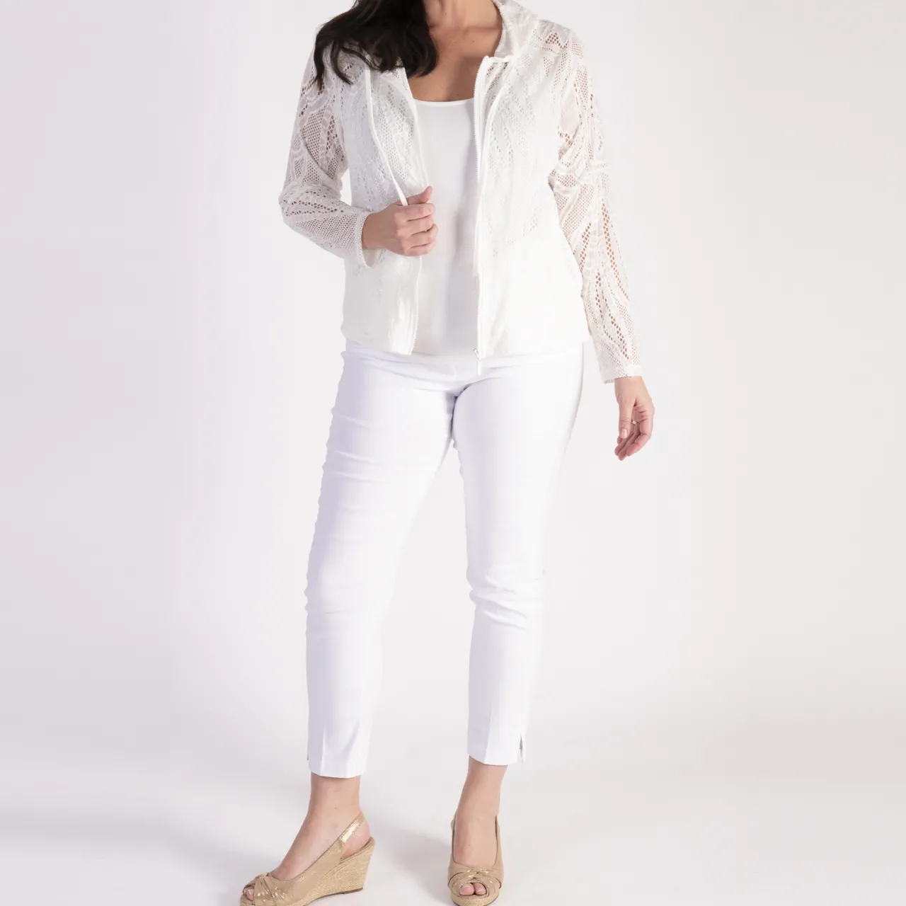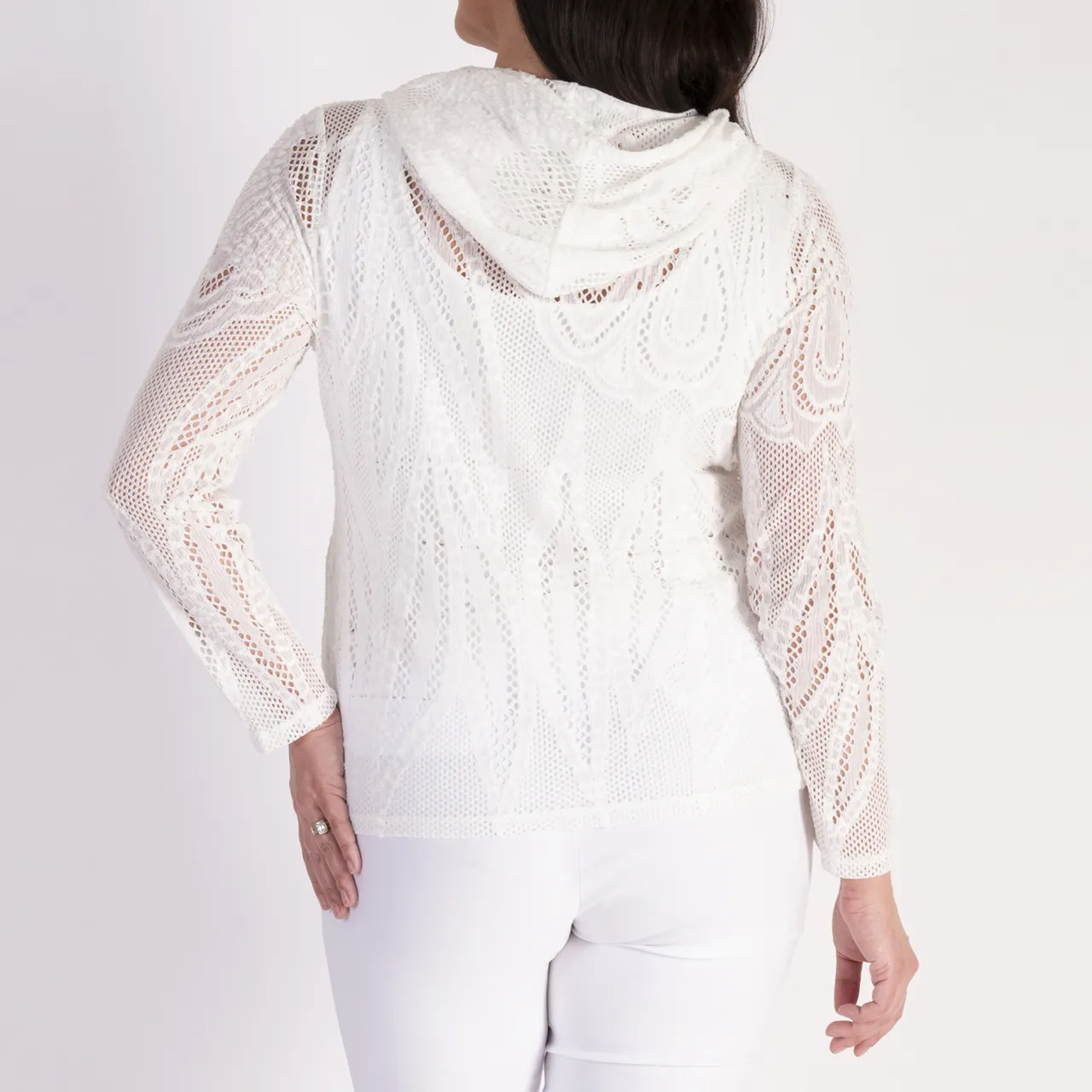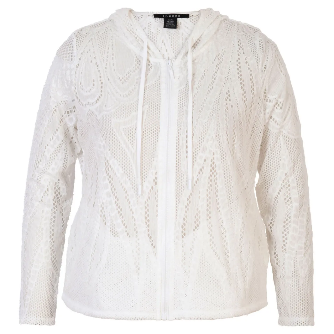 - Hooded neckline, lightweight, zip front, lace mesh blend