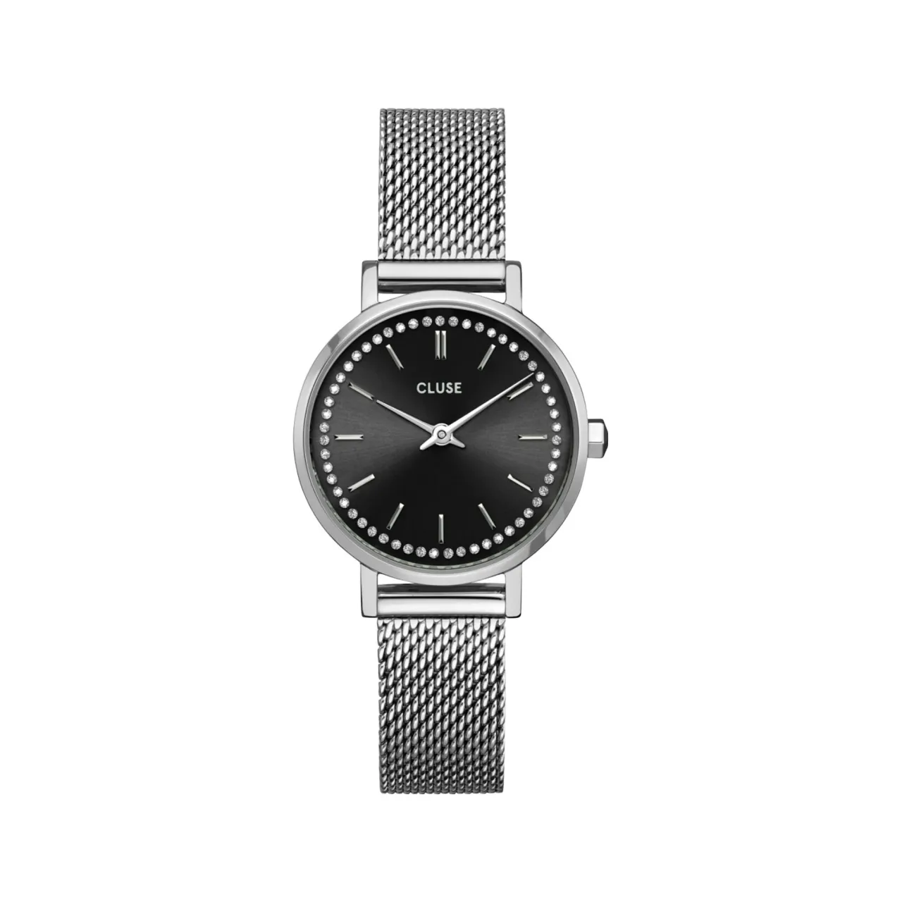 - Crystal-embellishment, silver-tone round case, mesh strap, interchangeable strap, water resistance 5 ATM