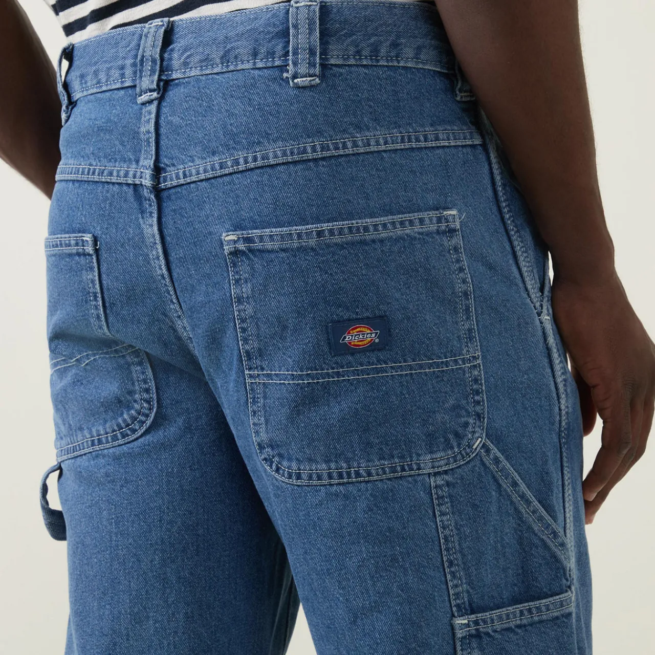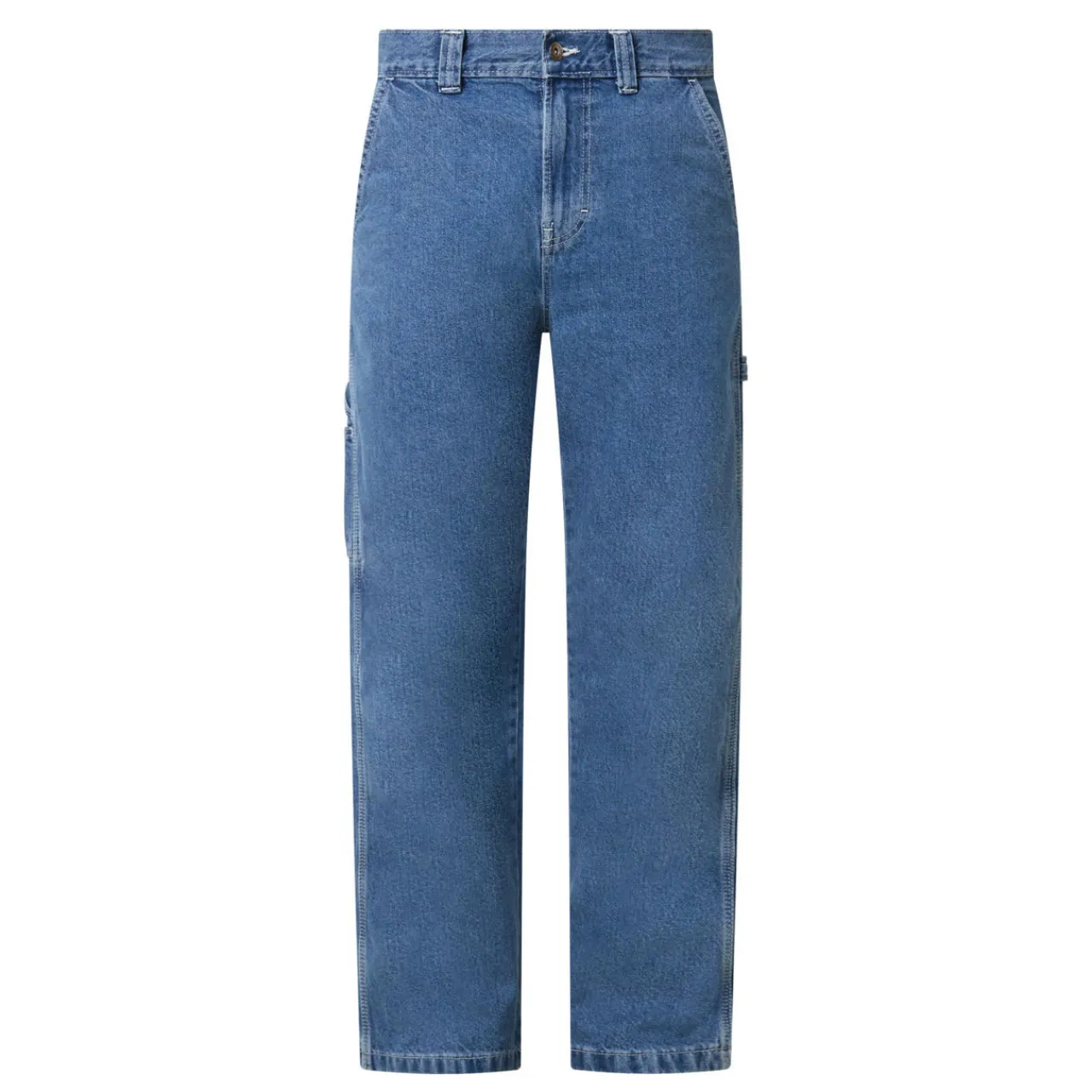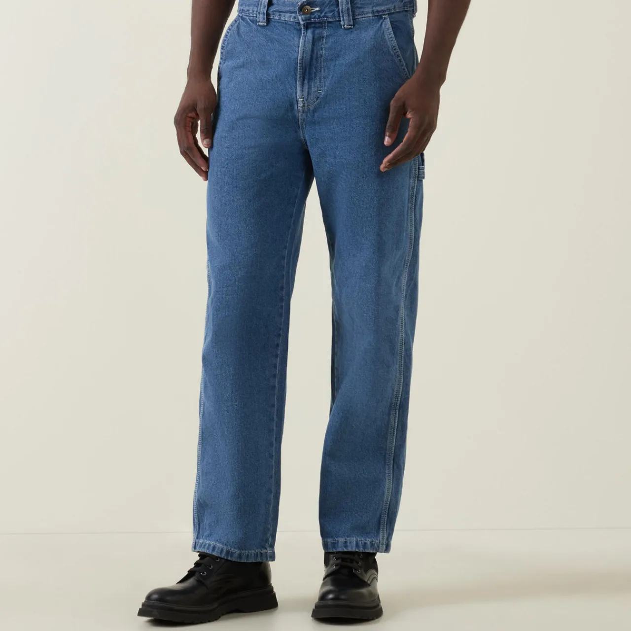 - Straight leg, mid rise, dual tool pockets, two open back pockets, zip and button fly, hammer loop, loose fit