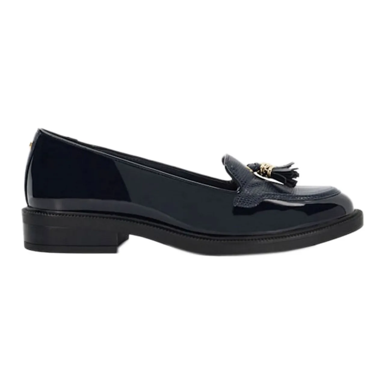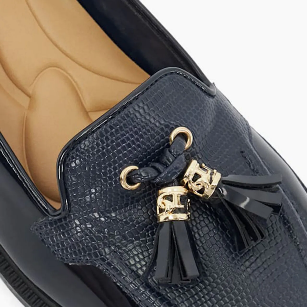 - Almond-shape toe, low vamp, block heel, tassel embellishment, gold-tone hardware, patent finish, padded insole, logo details