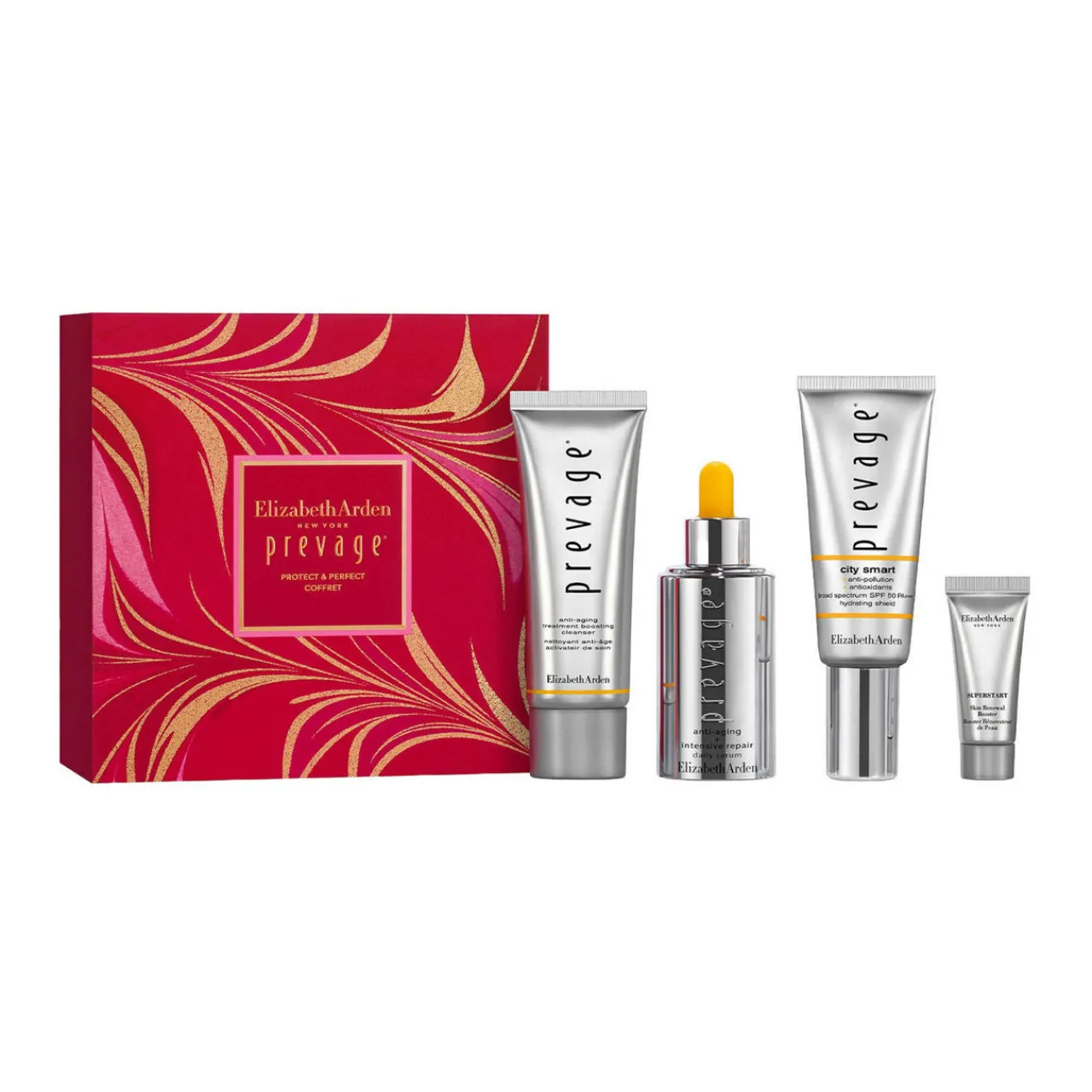 The PREVAGE® “Protect & Perfect” Intensive Serum Set contains a full-size PREVAGE® Anti-Aging + Intensive Repair Daily Serum to counteract the visible signs of aging and SUPERSTART Skin Renewal Booster to restore the healthy look of skin’s surface layer, fortifying its natural ability to repair and renew. Also included is PREVAGE® Anti-Aging Treatment Boosting Cleanser, to clean and prep skin for maximum treatment benefits, and City Smart + DNA Repair Complex + Anti-Pollution + Antioxidants Broad Spectrum SPF 50 Lotion PA +++ Hydrating Shield, an effective, high-protection facial sunscreen, formulated with DNA Enzyme Complex™ to strengthen skin’s natural defences.
