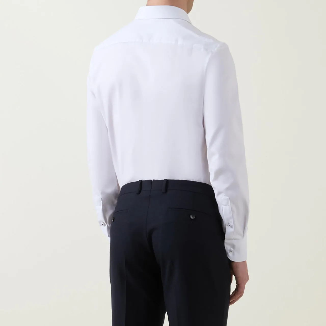 - Pointed collar, long sleeves, button fastenings, curved hemline, buttoned cuffs, single cuffs