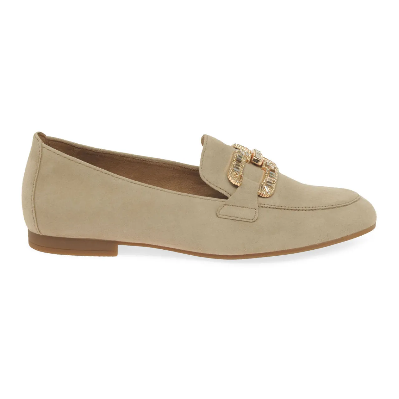 - Slip-on style, tonal stitching, embellished gold-tone buckle trim, low block heel, round toe