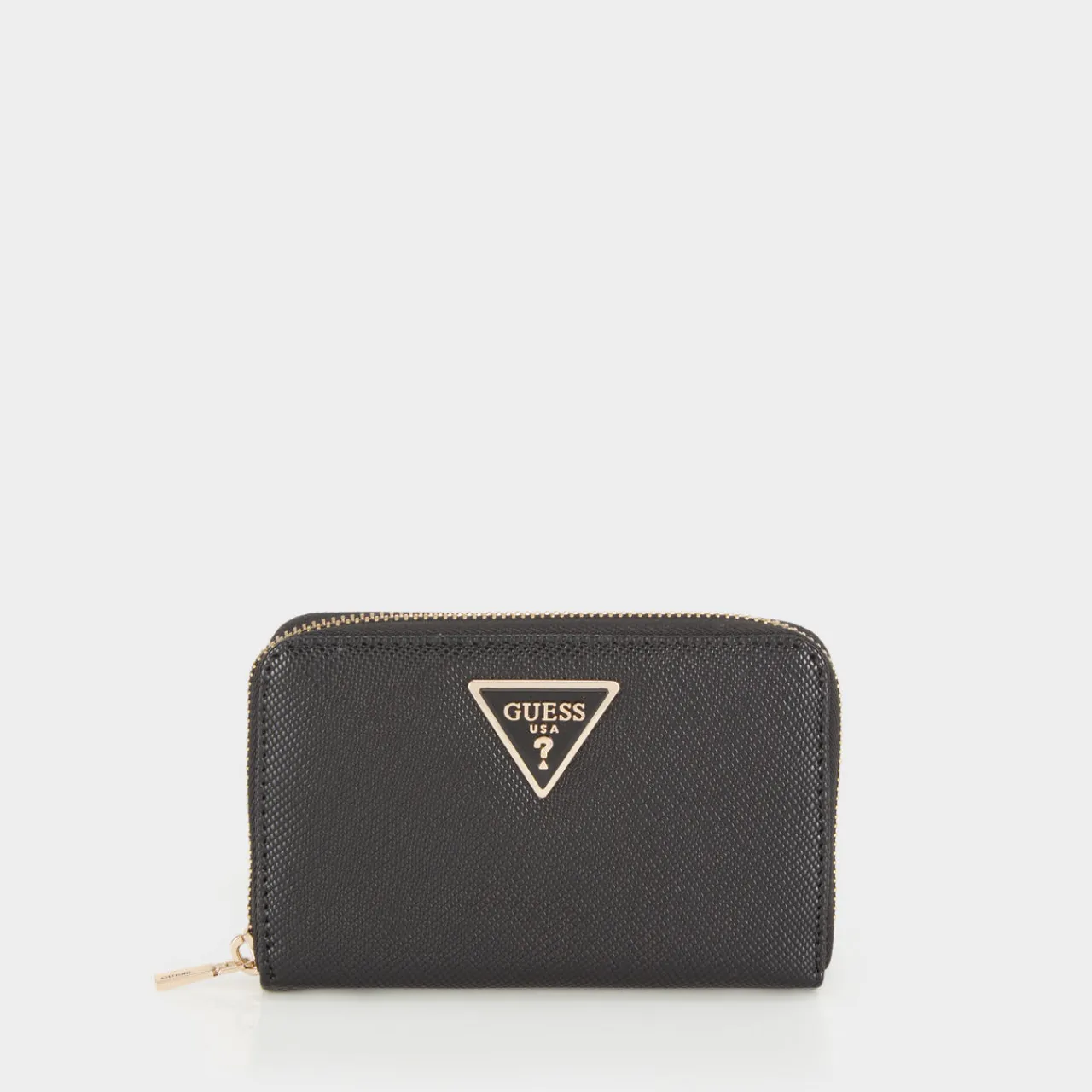 - Zip-around closure, triangular logo detail, gold-tone hardware, texture finish, accordion-style interior