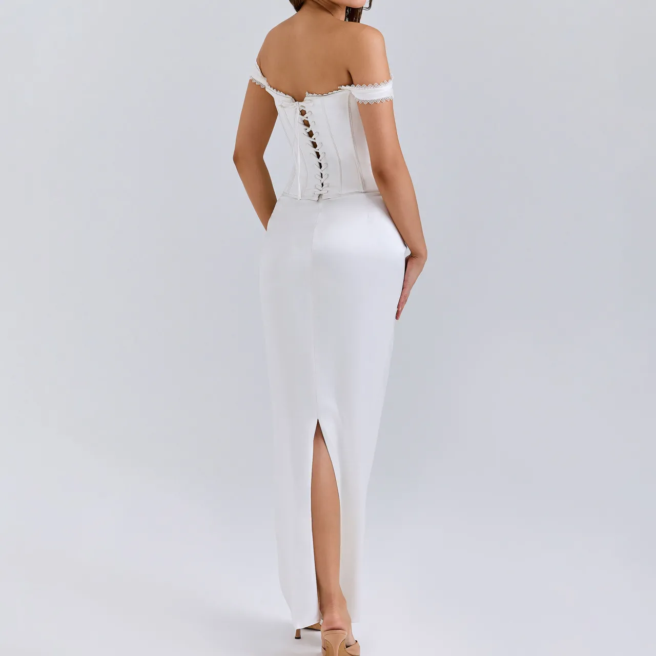 - Boned corset, off-shoulder design, removable straps, scallop lace trim, lace-up back, side zip, maxi skirt with back split