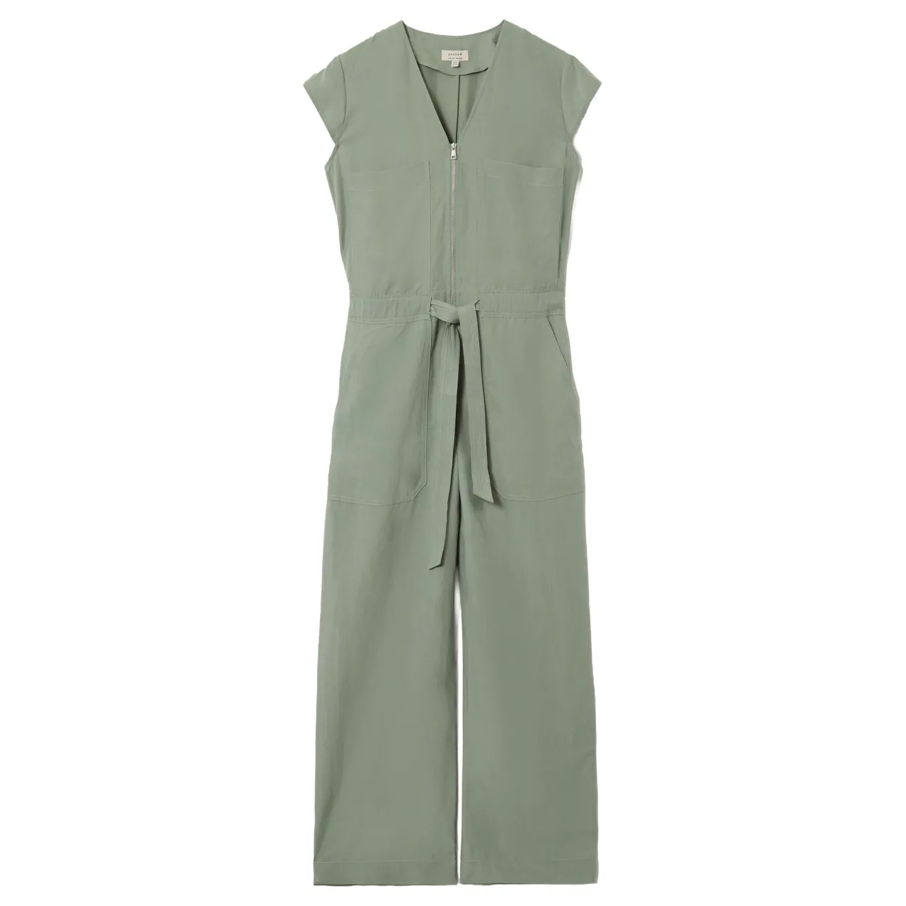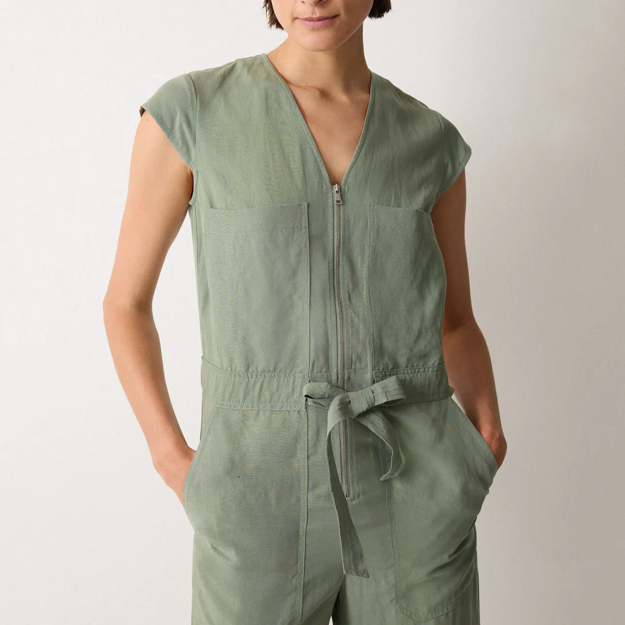 - V-neck, short sleeves, front zip fastening, cropped length