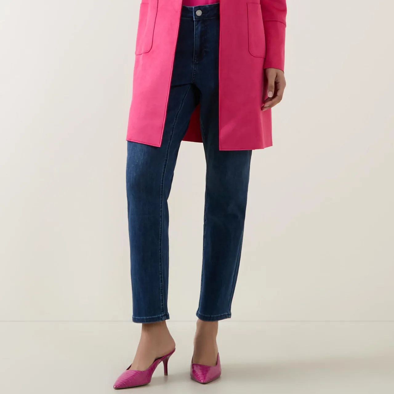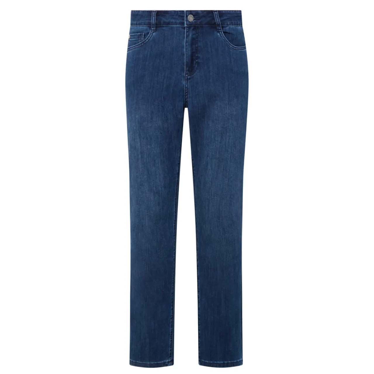 - Mid-rise waist, five-pocket style, straight-leg, zip and button fastening, belt loops, logo plaque