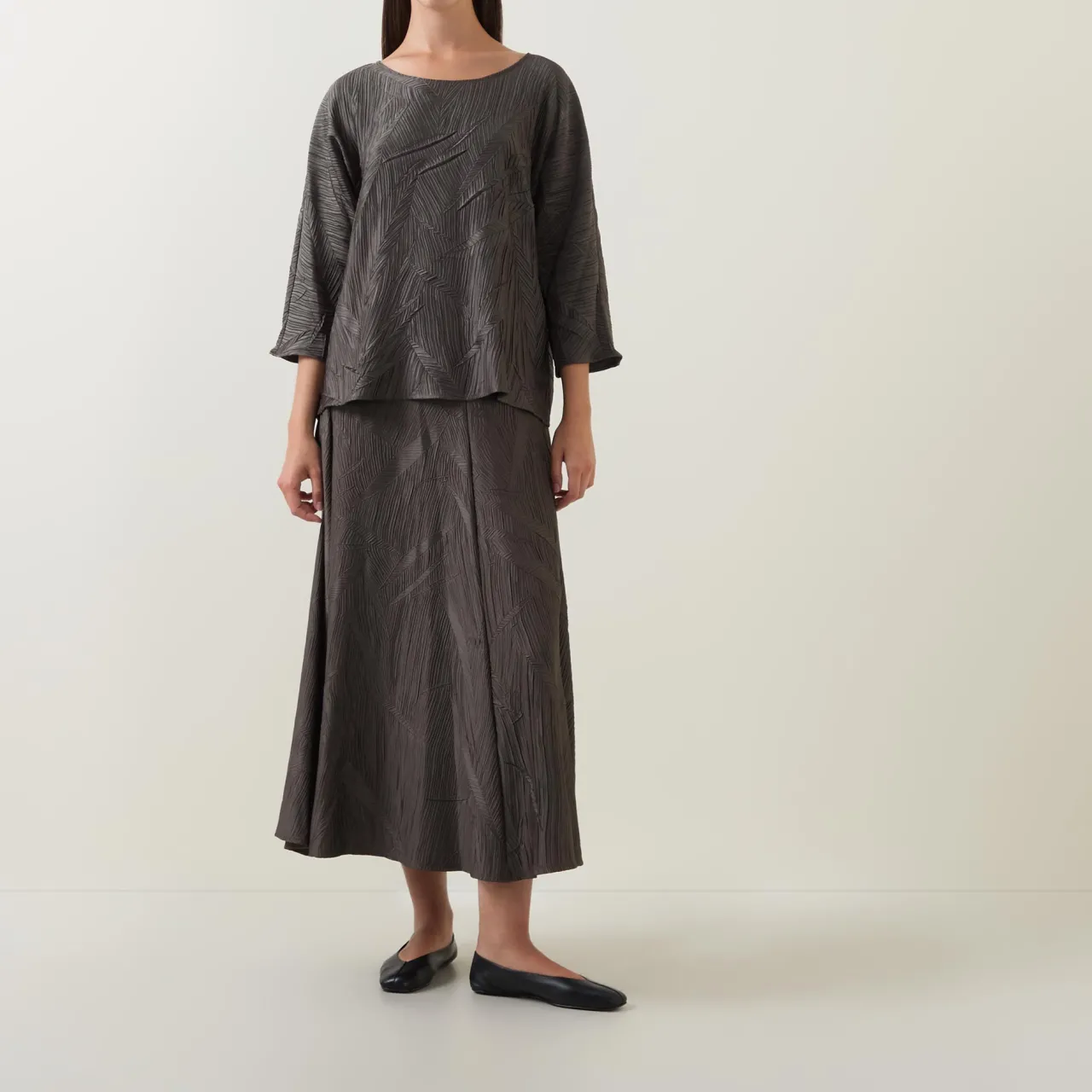 - Wide round neckline, three-quarter length sleeves, flared hem, textured pattern