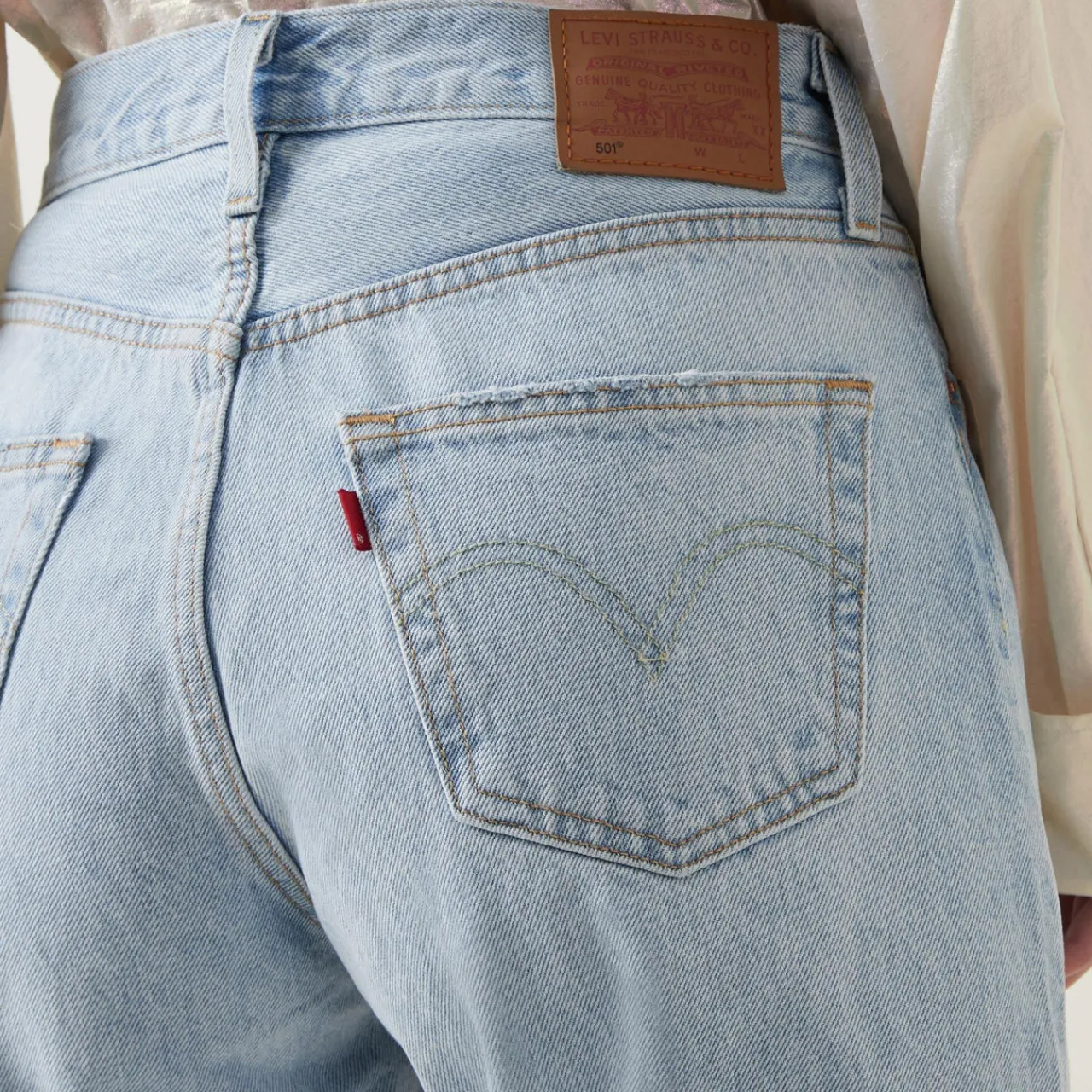 - High rise, straight leg, five-pocket design, branded patch.
