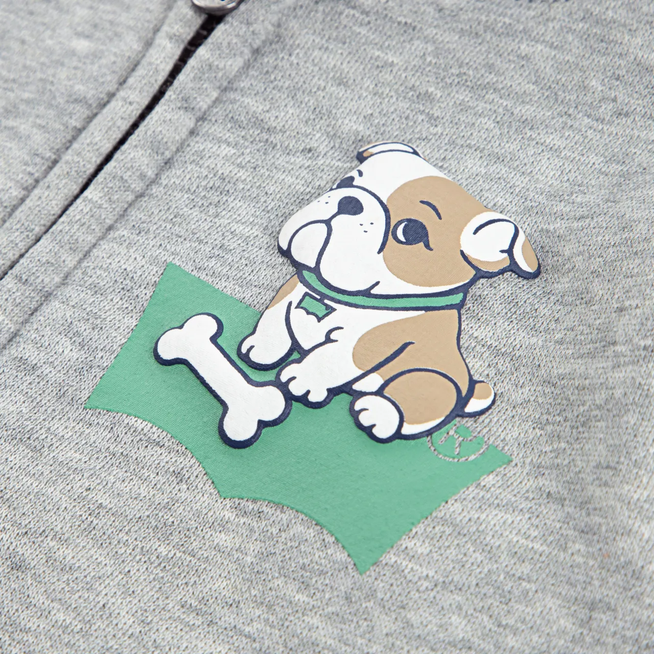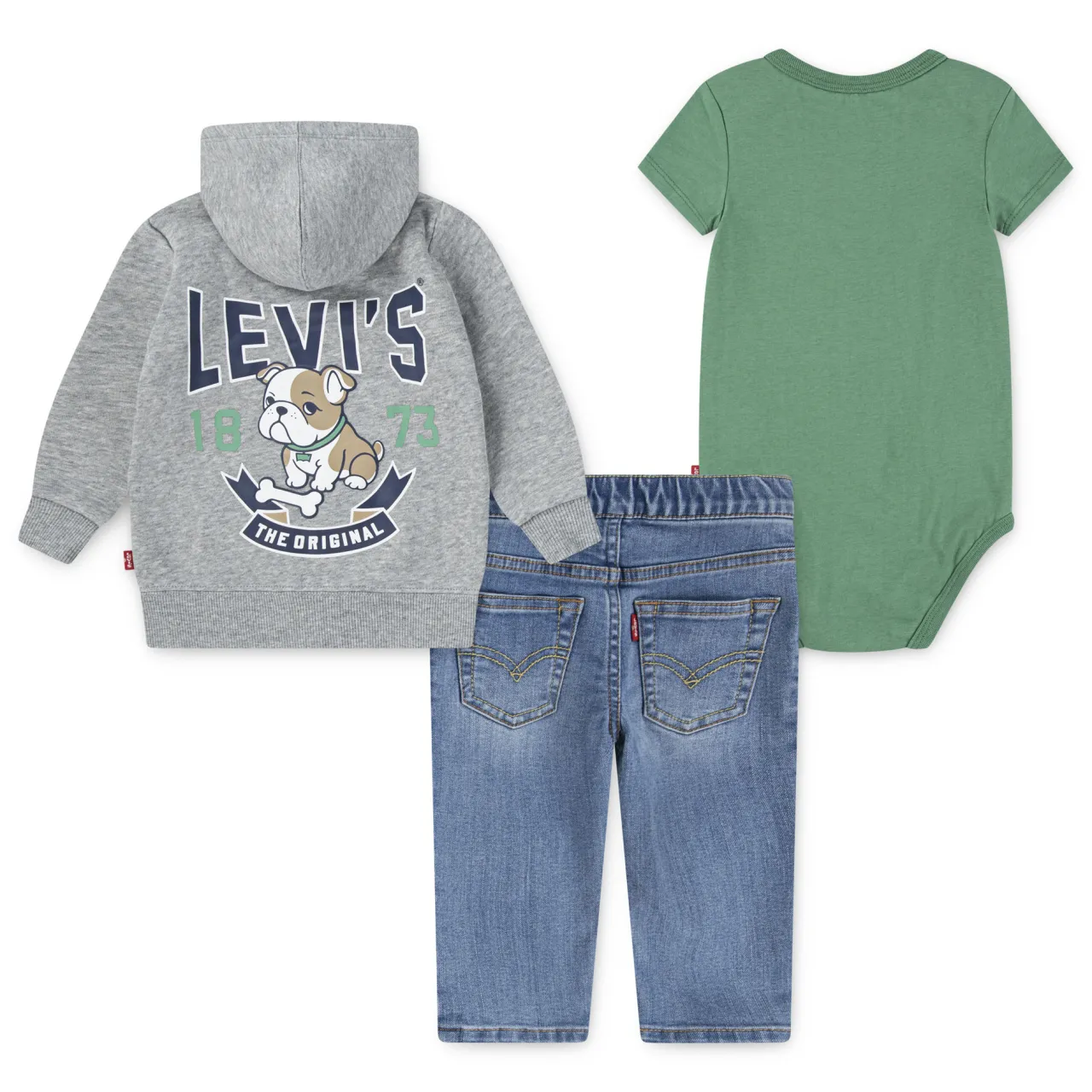 - Bodysuit: Short sleeves, logo detail, overlap shoulders, round neckline, graphic logo, snap tape closures, jersey fabric. Hoodie: Full-zip fastening, two pockets, dog logo printed details, fleece fabric. Jeans: Stretch-fused denim, semi-elasticated waistband, hook and eye closure, straight-leg silhouette, signature back pocket