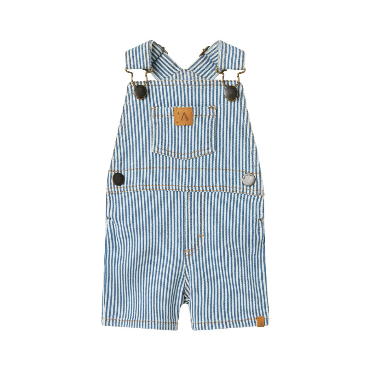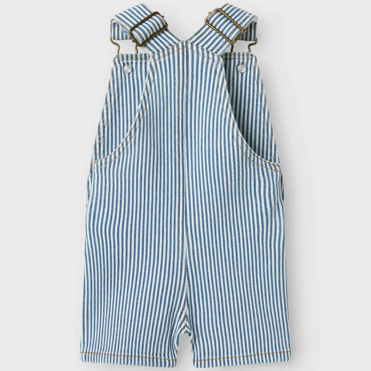 - Two adjustable straps with metal clasps, square neckline, button fastening, front chest pocket with logo patch, contrast top stitching, striped pattern, smooth fabric