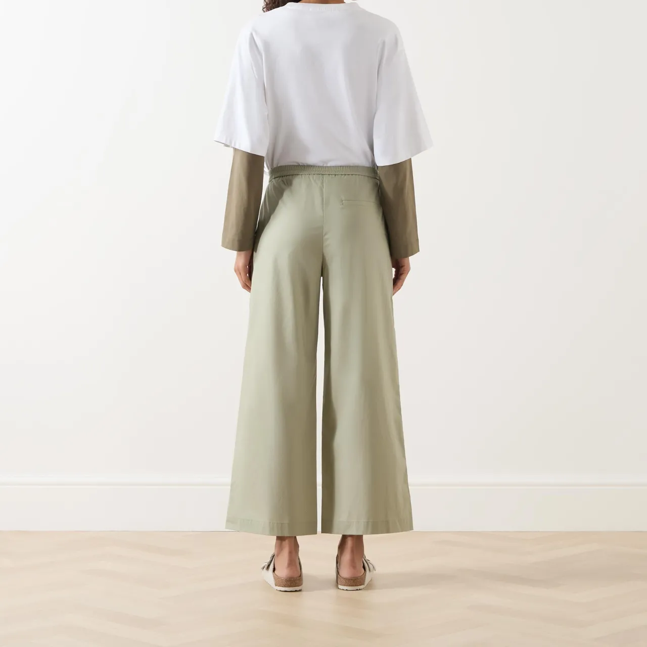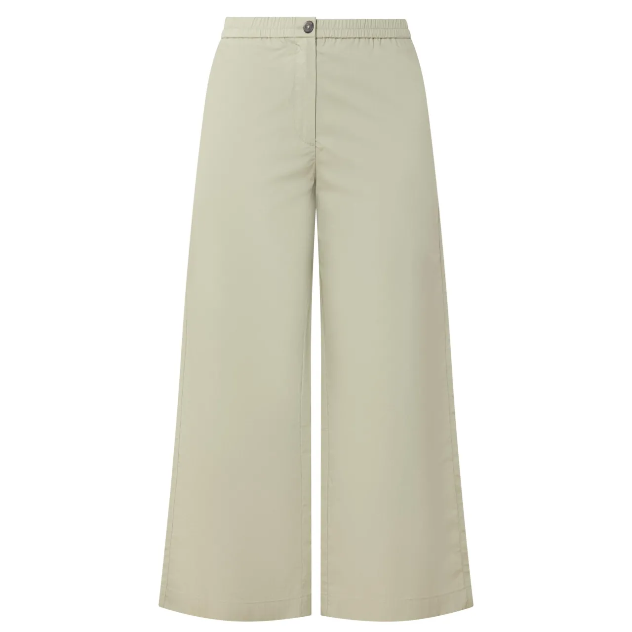 - Mid-rise, wide leg, cropped length, elasticated waistband, concealed fly and button fastening, two side entry pockets, one rear welt pocket, clean hems, woven finish