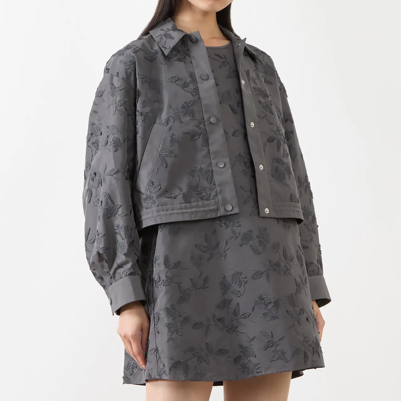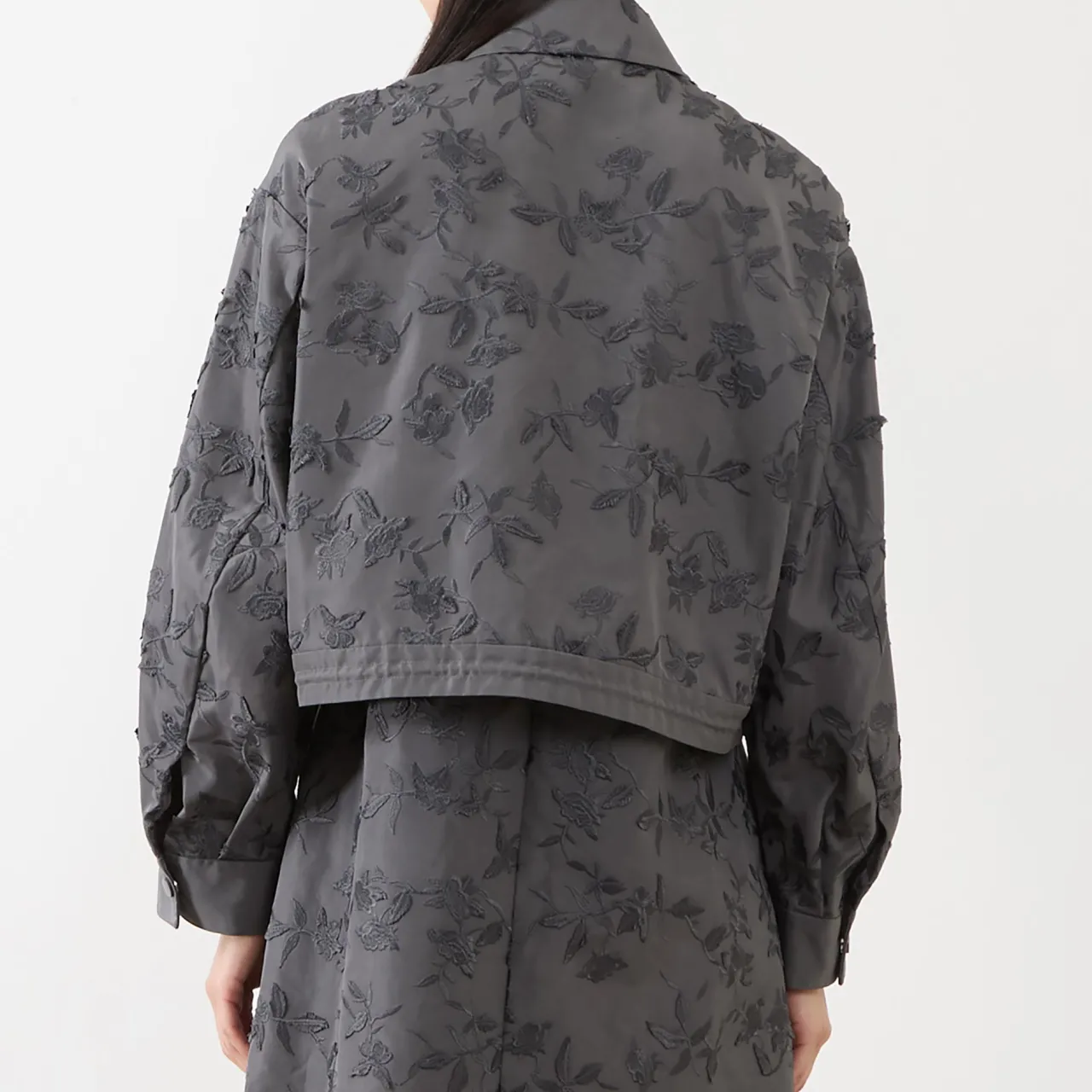 - All-over jacquard embroidery, relaxed fit, cropped, elasticated drawstring hem, welt pockets, press stud placket