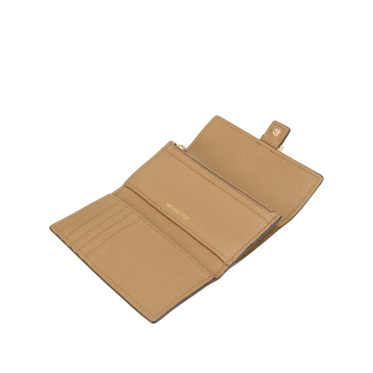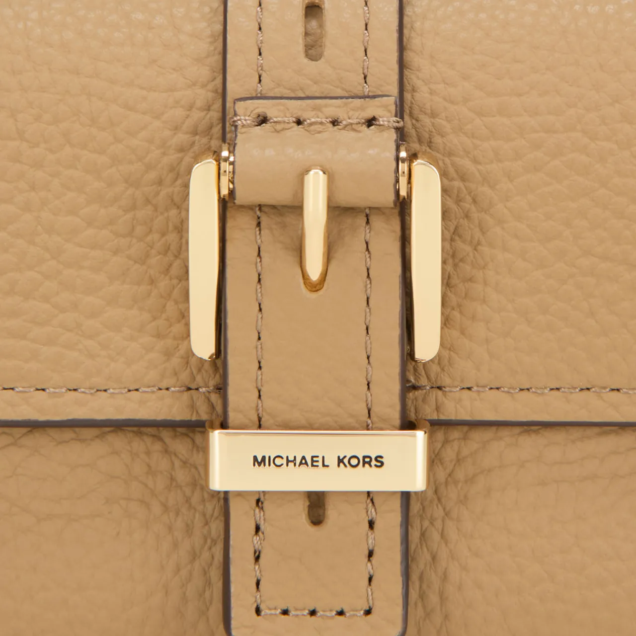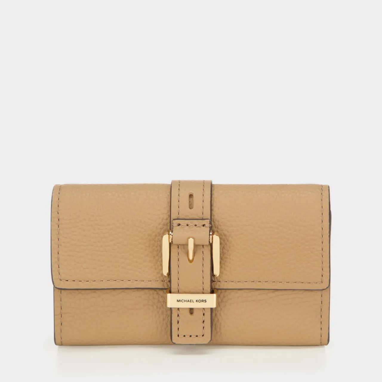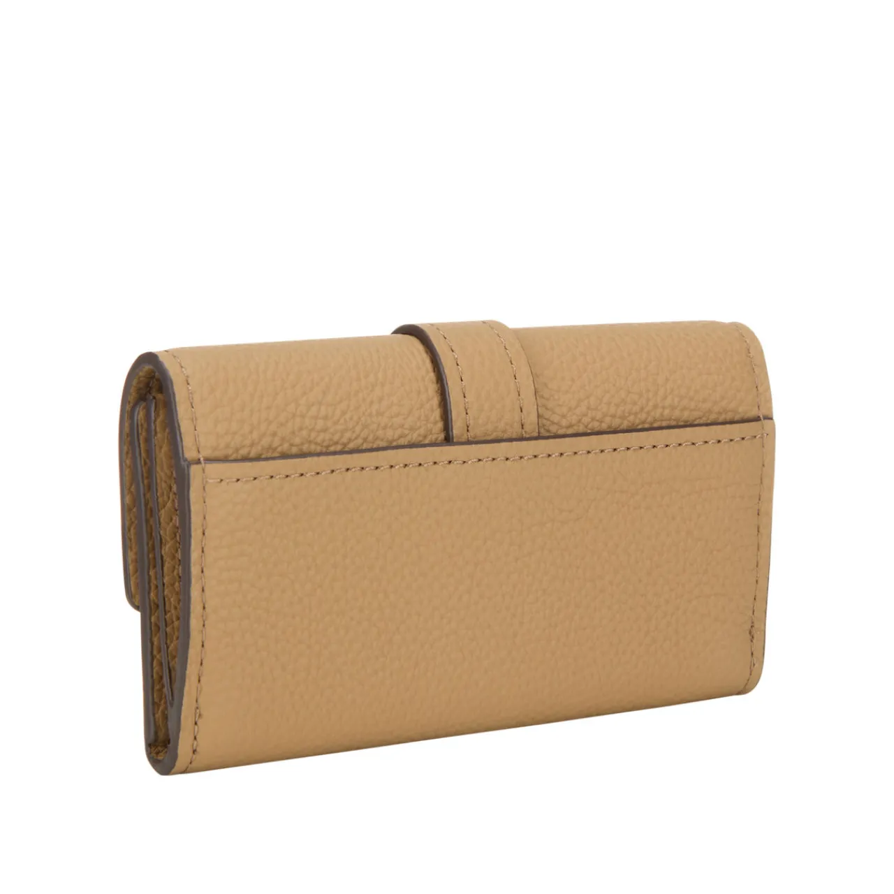 - Foldover flap, snap-button fastening, front buckle detail, gold-tone hardware, engraved logo branding, back slip pocket, tonal stitching, grained leather finish