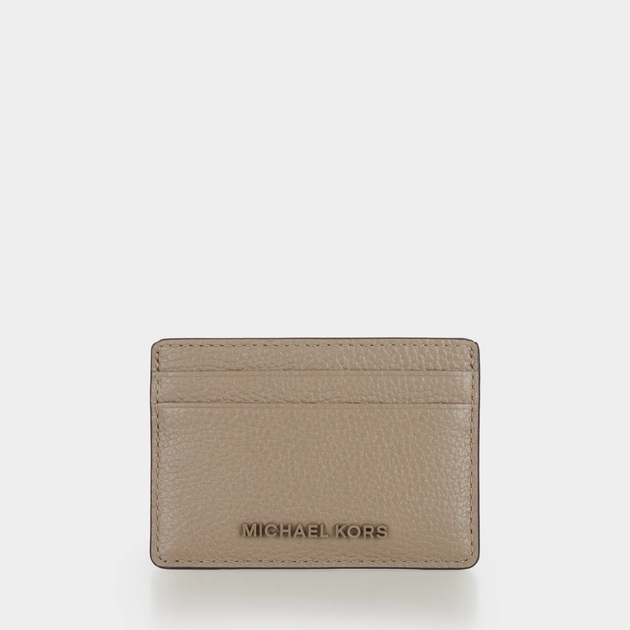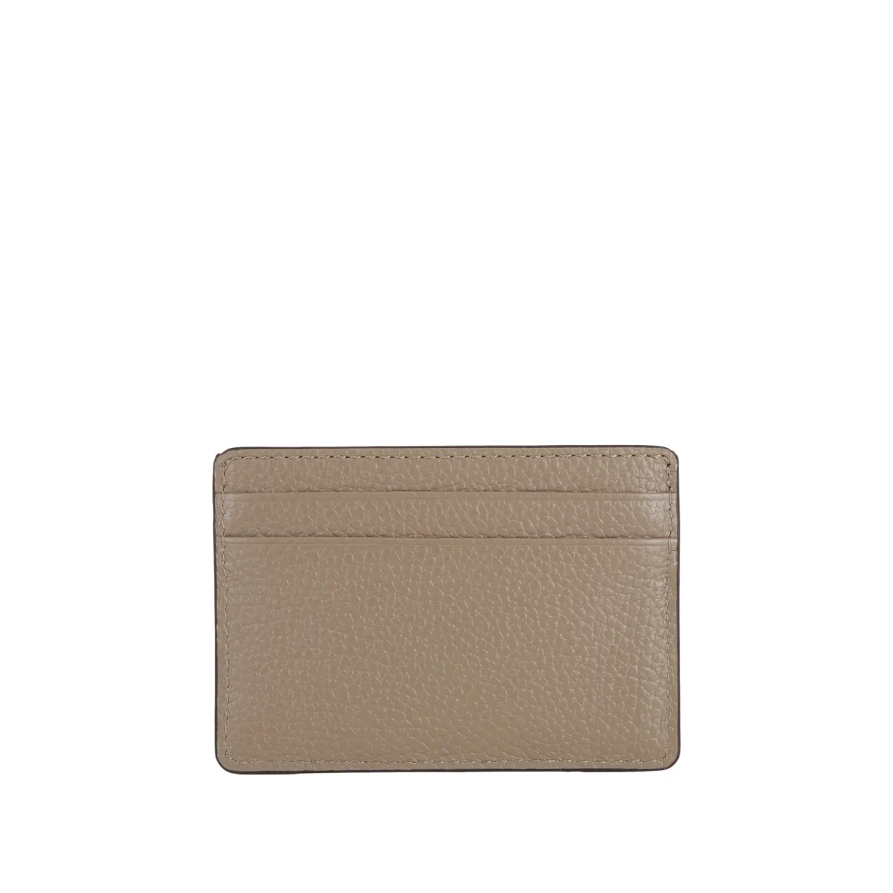 - Four card slots, one slip pocket, tonal logo hardware, pebbled leather finish