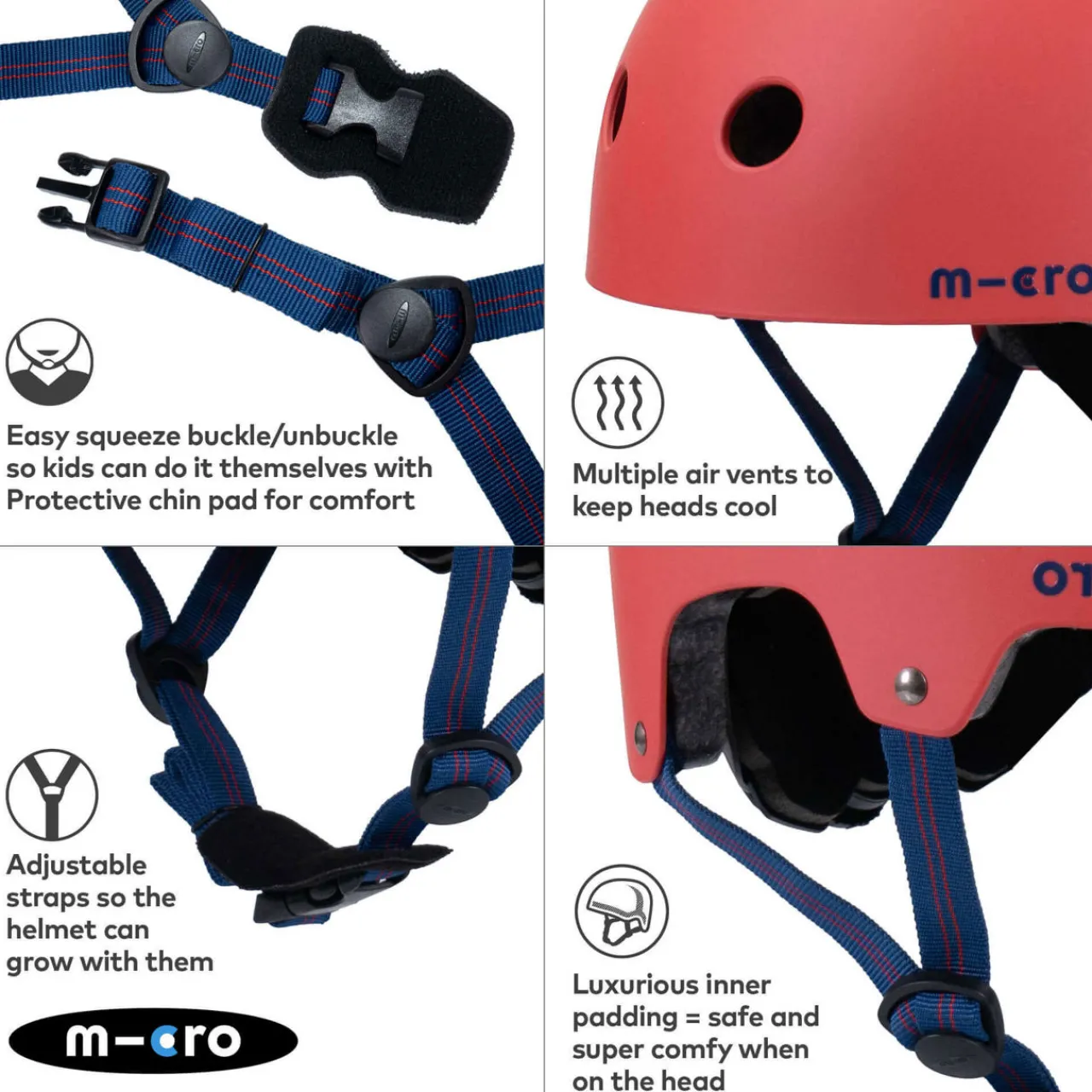 - Rear flashing light, easy fastening chin strap, adjustable chin strap, air vents, extra padding, logo