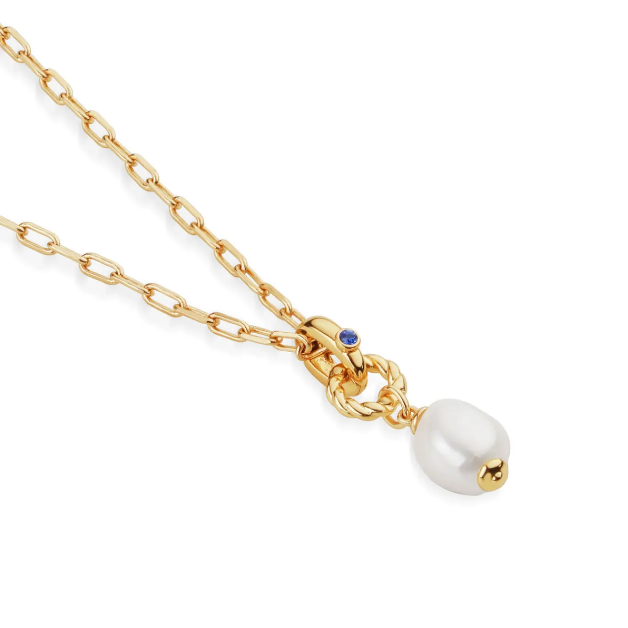 - 14k Gold Plated Pendant, with a protective anti-tarnish layer, baroque pearl and sapphire blue crystal stone settings, drop pendant design