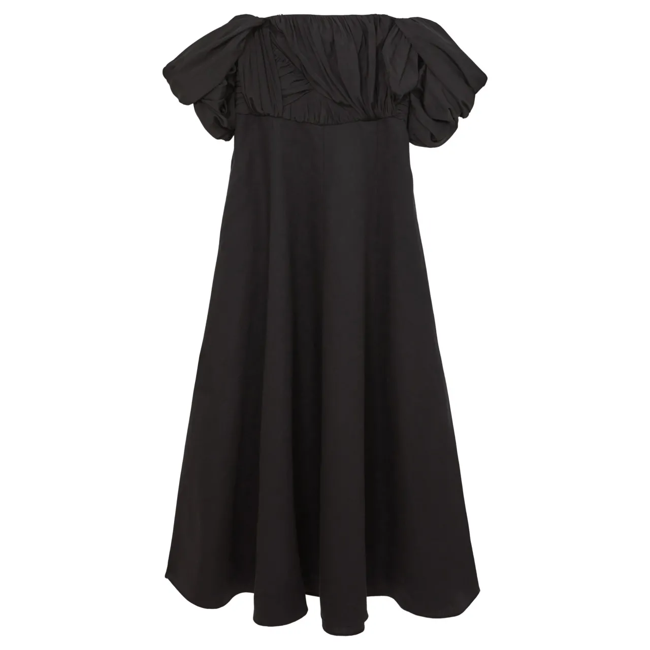 - Bardot neckline, gathered bodice, twisted off-the-shoulder sleeves, flared midi skirt, concealed zip fastening to reverse