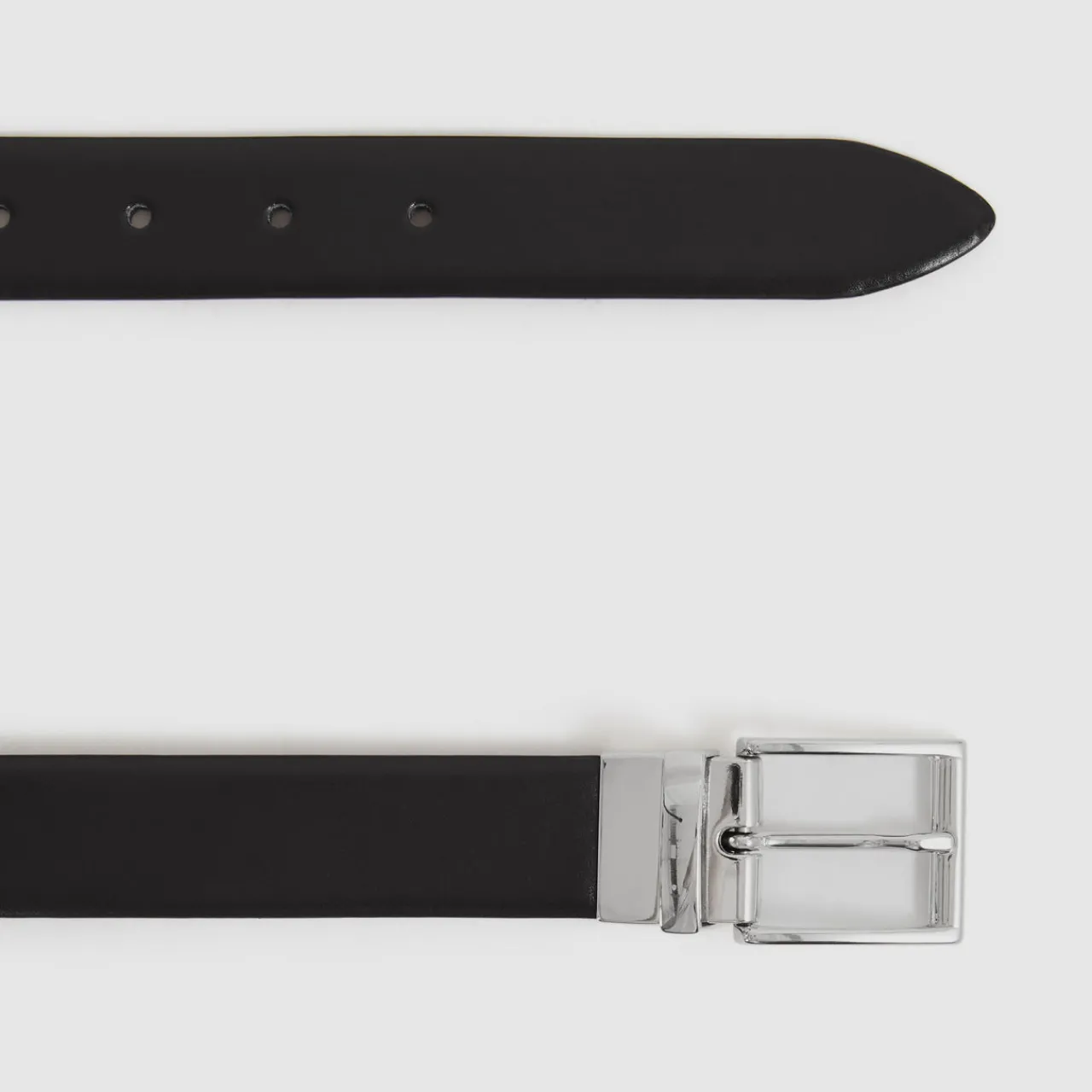 - Smooth leather, reversible black and dark brown design, adjustable buckle fastening, silver-tone hardware, tapered tip
