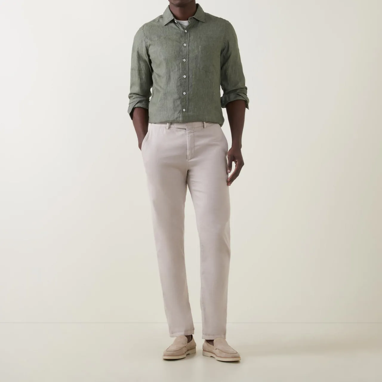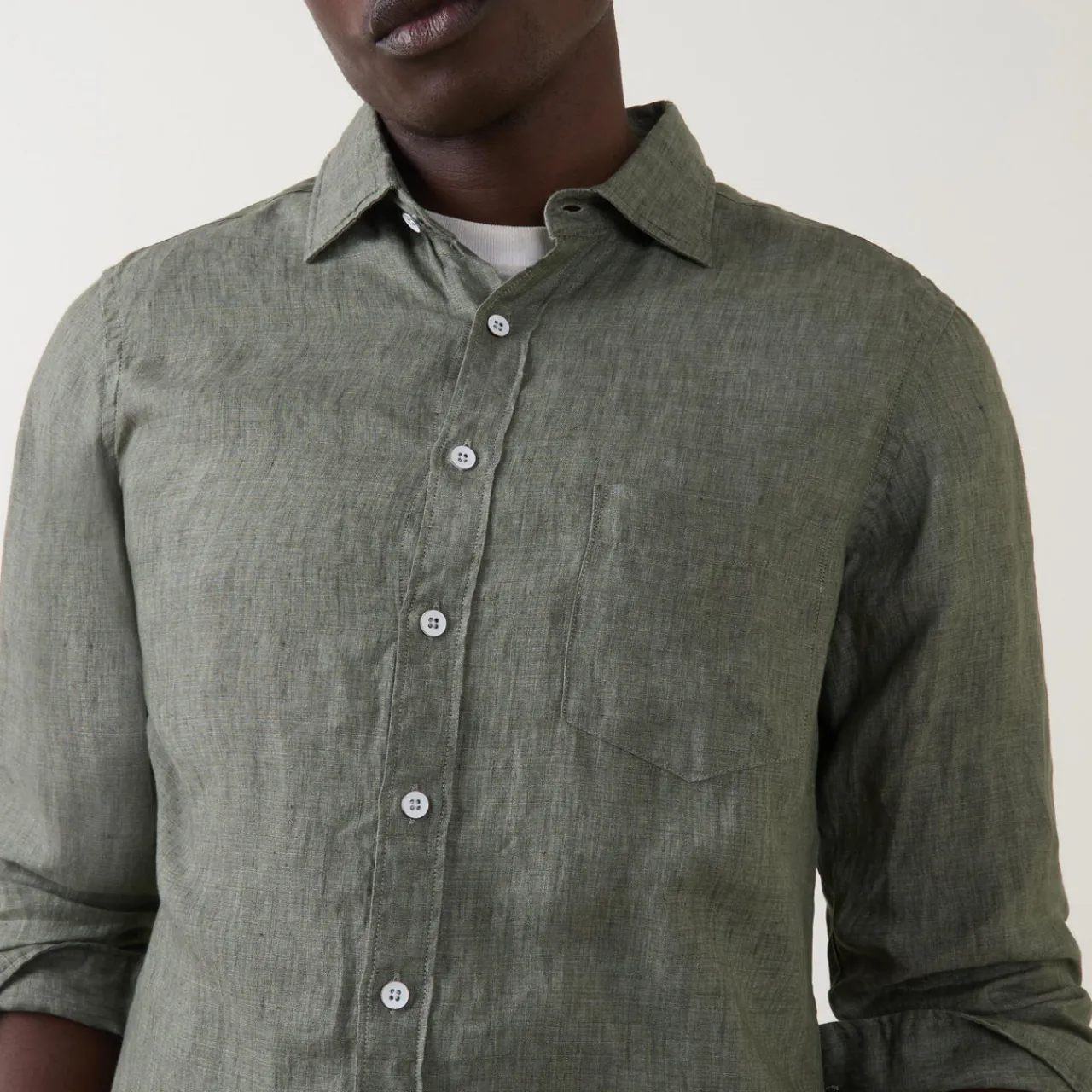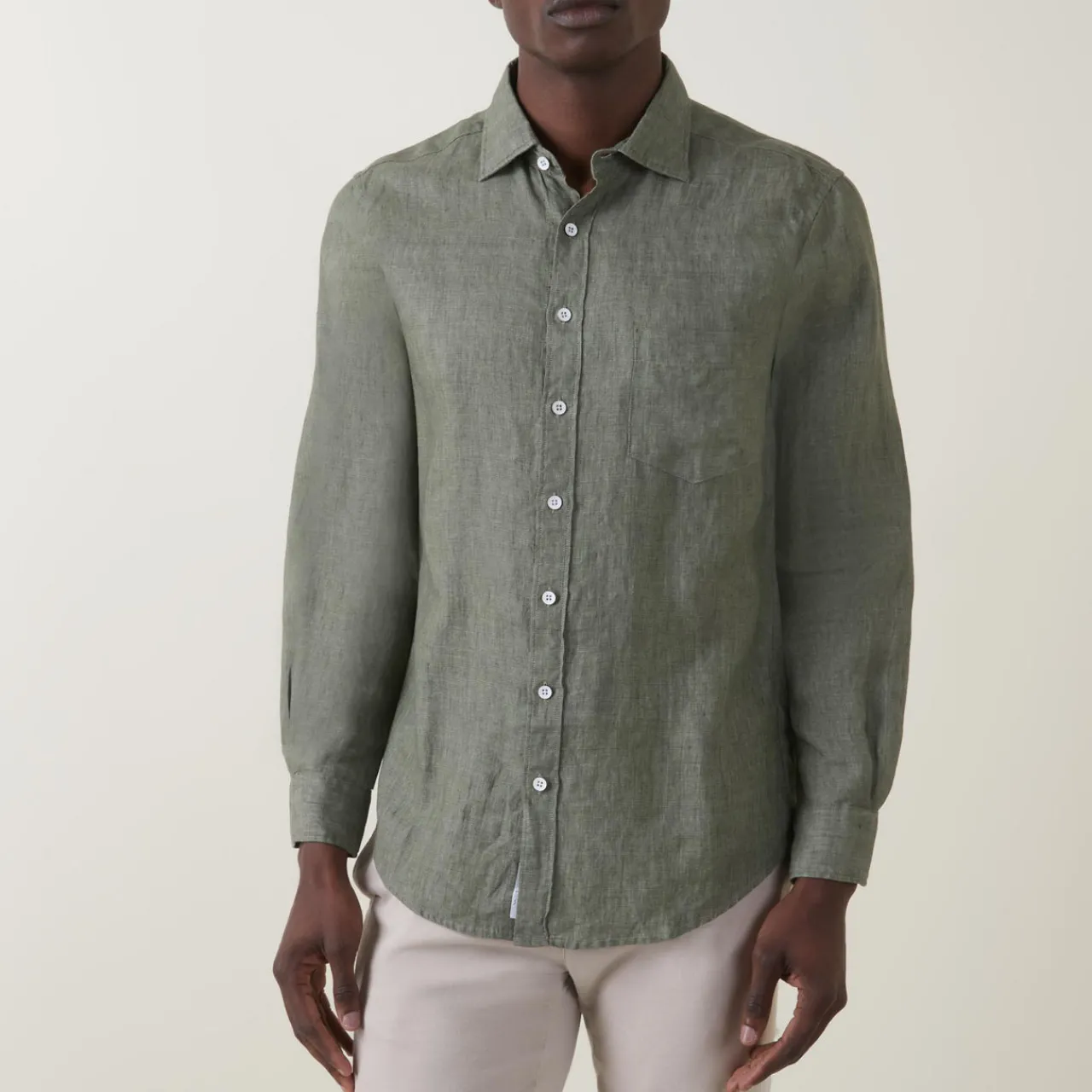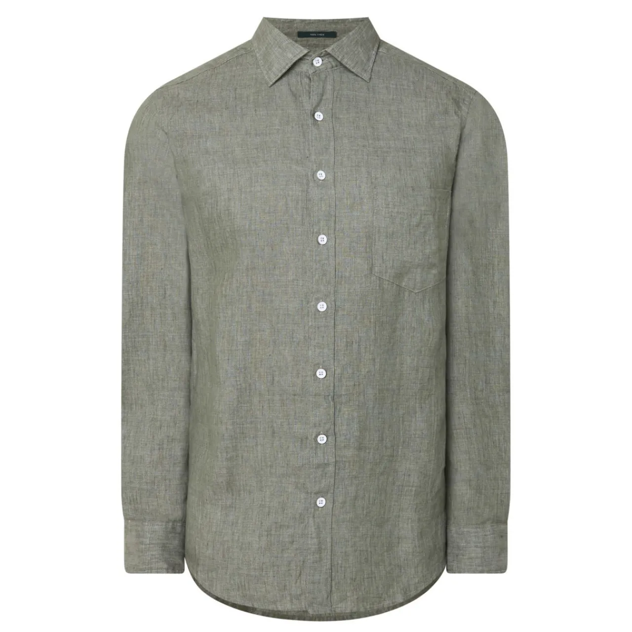 - Point collar, long sleeves, buttoned cuffs, one chest patch pocket, front button fastening, curved hem, lightweight, breathable