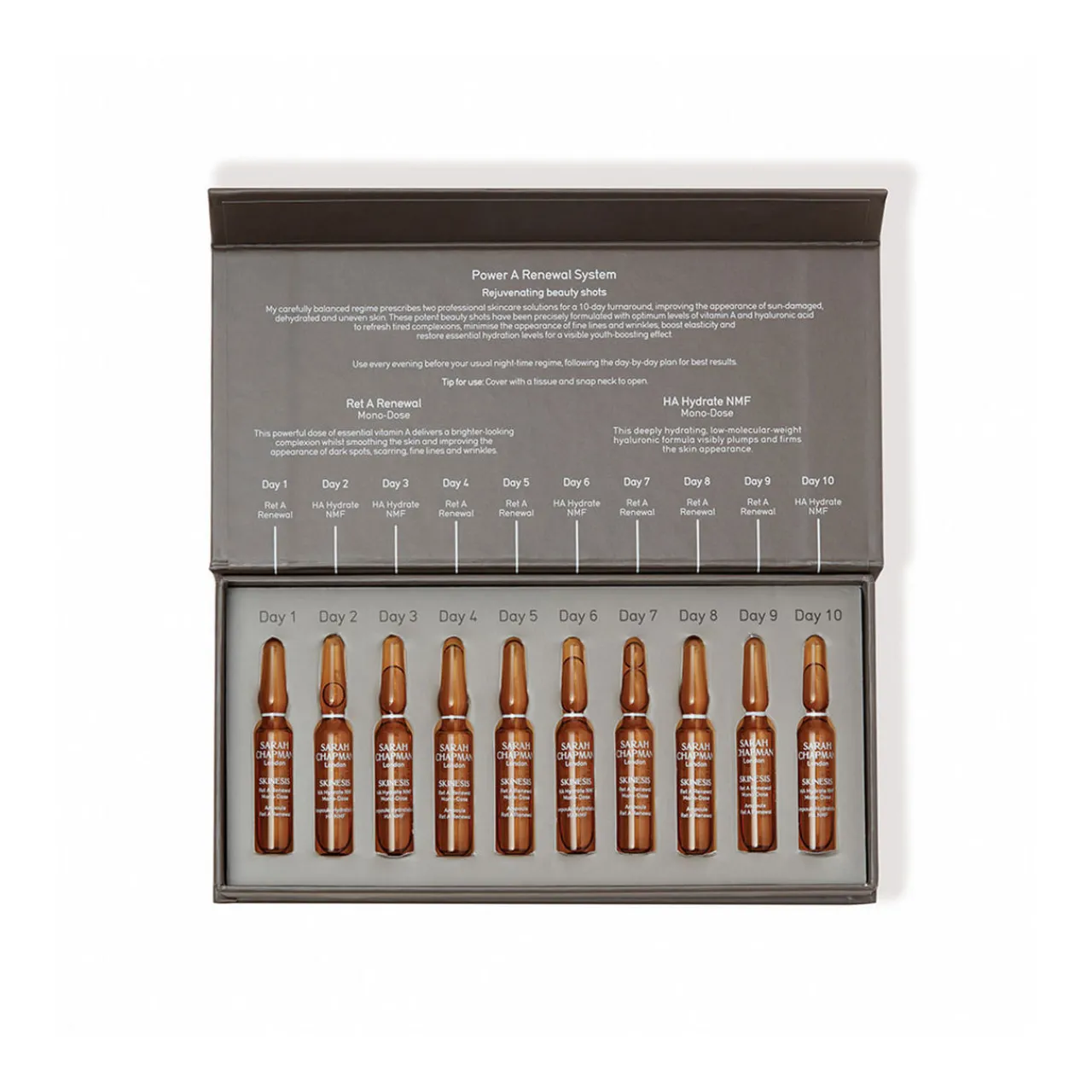 This supercharged skin-renewal system features concentrated doses of two potent formulas for a complete complexion revival in 10 days. Prescribing a carefully balanced ampoule programme of intensive, single-dose skincare shots, this rejuvenation system targets photo-damage, uneven pigmentation, fine lines and wrinkles to smooth the complexion and deliver essential hydration for firm, plump and glowing skin.