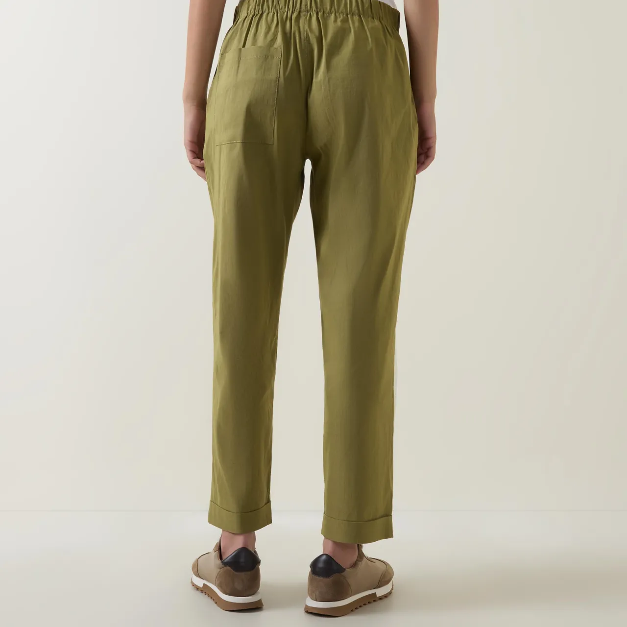 - Elasticated waistband, faux fly, straight-cut legs, turned-up cuffs, side entry pockets, rear patch pockets