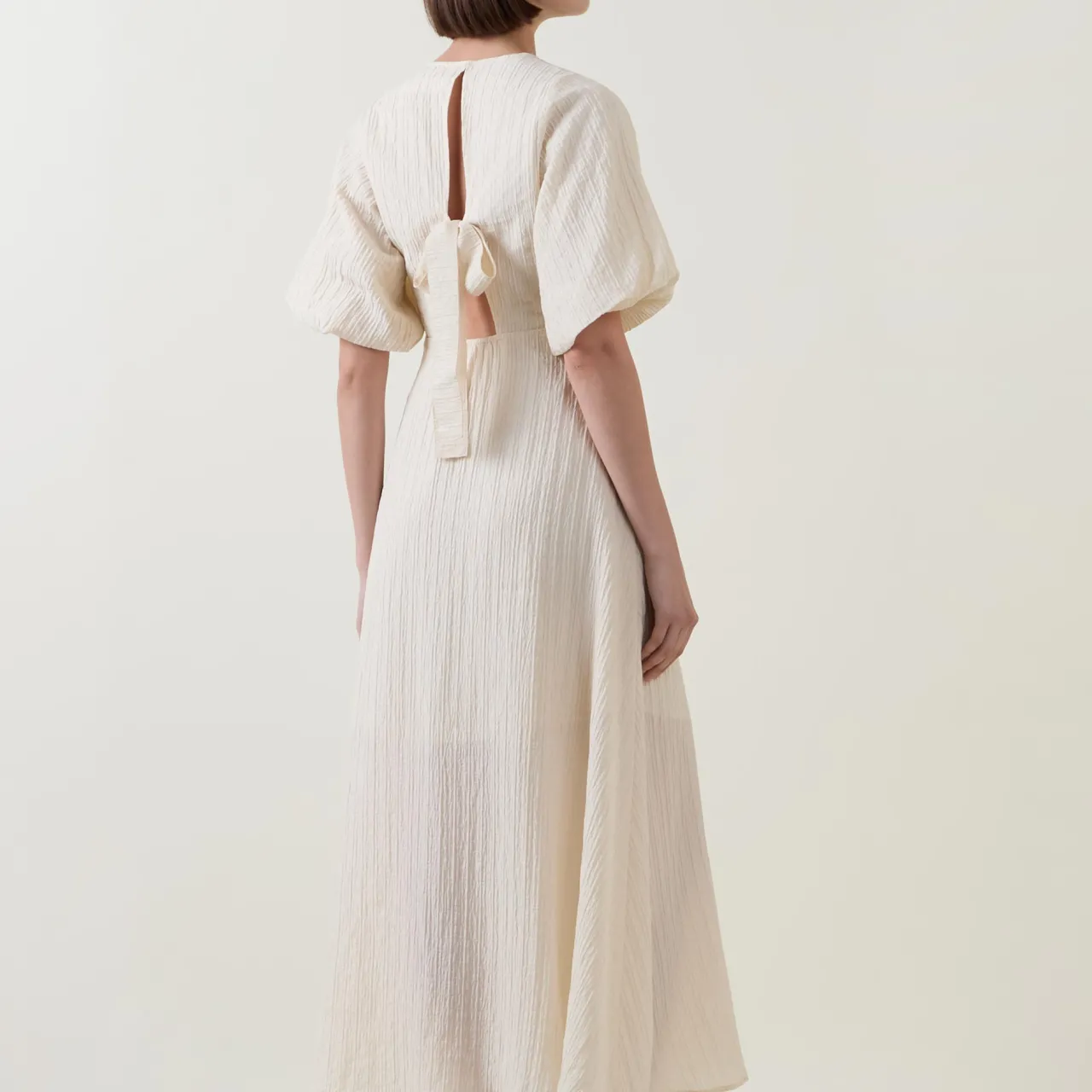 - Short puff sleeves, V-neckline, back keyhole and button fastening, back tie-fastening closure, flared silhouette, midi length