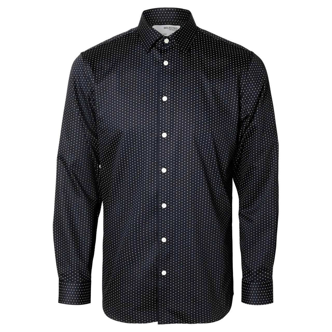 - Buttoned cuffs, shirt collar, long sleeves, button fastening, curved hem, printed design
