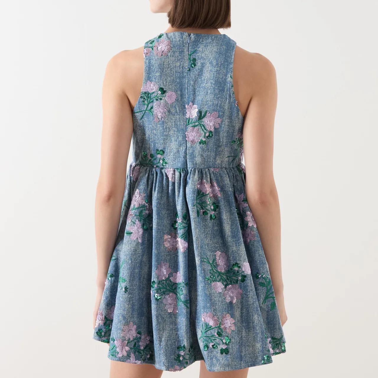- Round neckline, embellished detailing, mini length, sleeveless, babydoll style