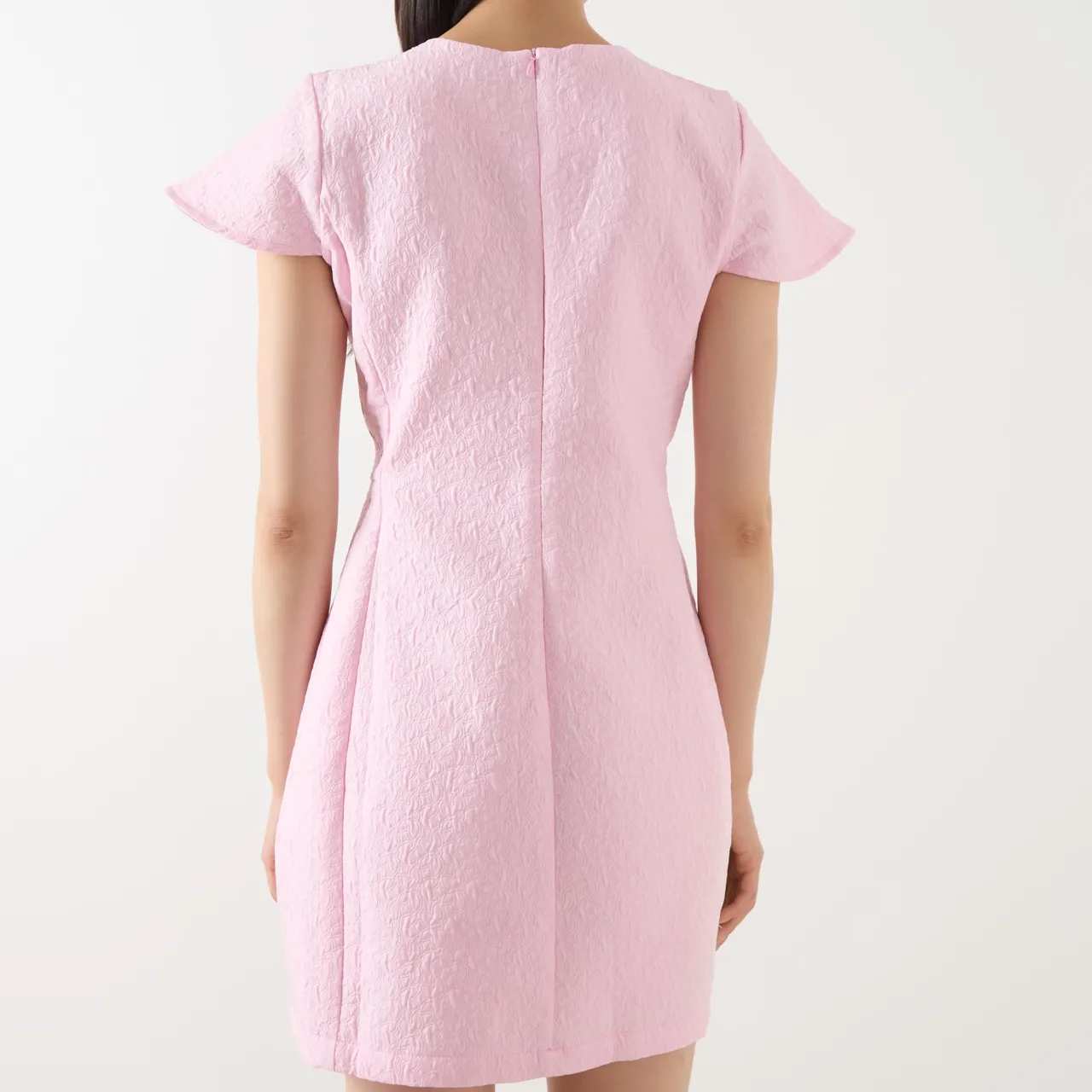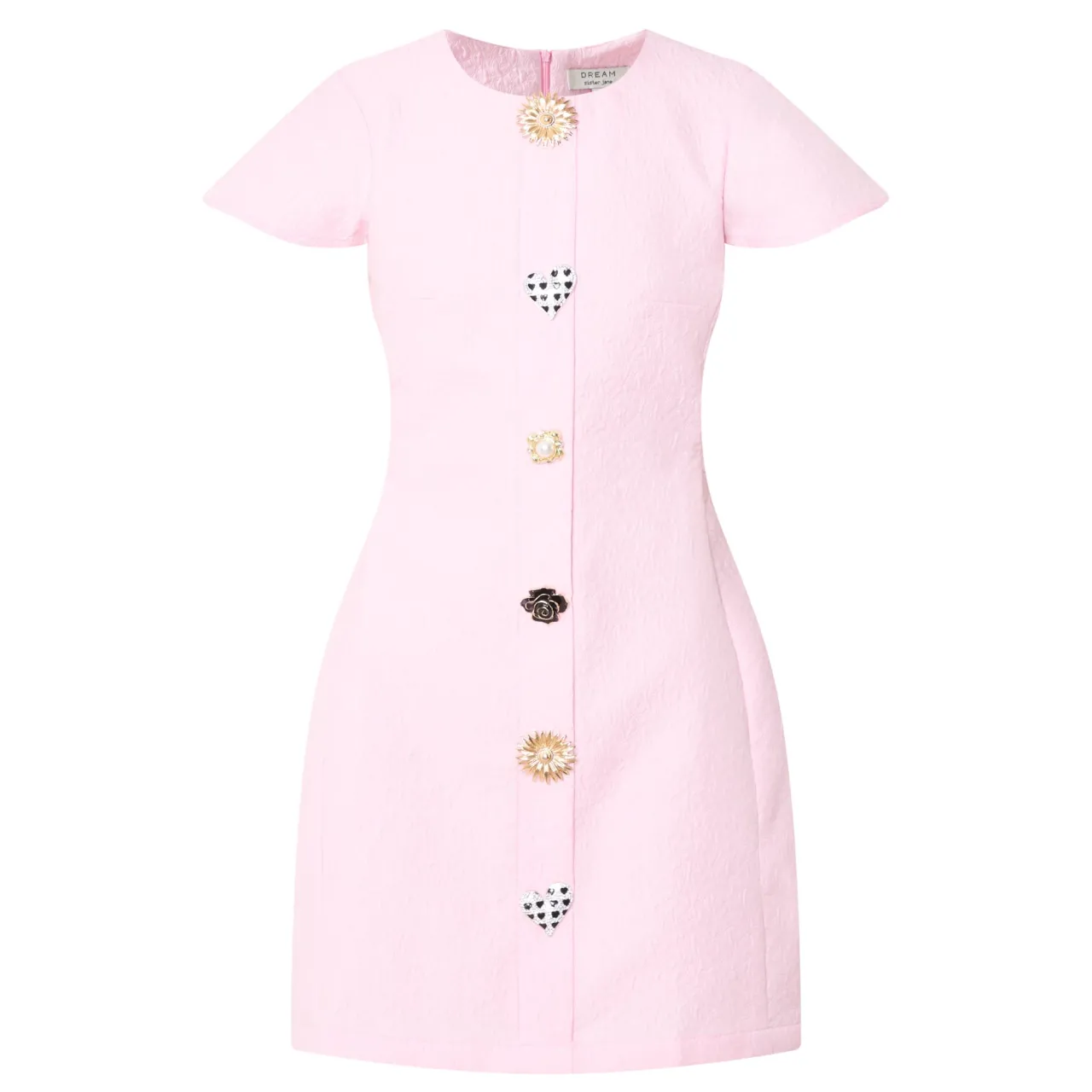 - Floral jacquard design, round neck, short sleeves, decorative buttons, mini length, concealed zip fastening