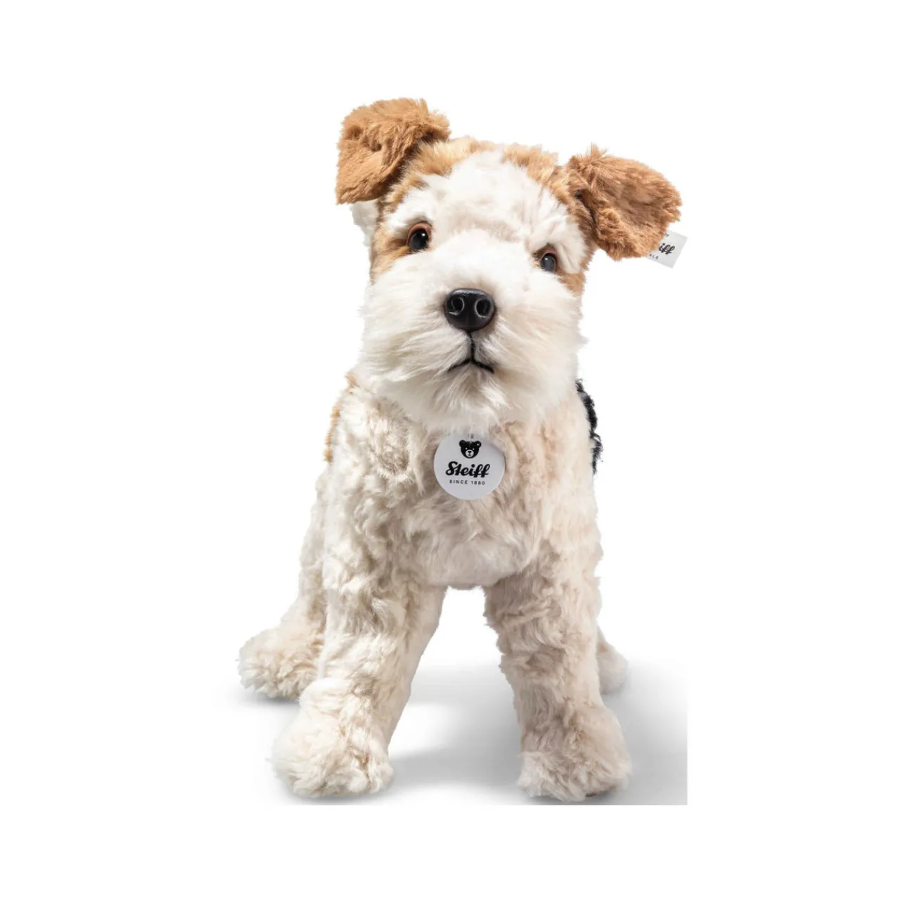 - Soft plush style, terrier dog design, stainless steel ‘Button in Ear’, standing pose, safety eyes, Steiff logo tab