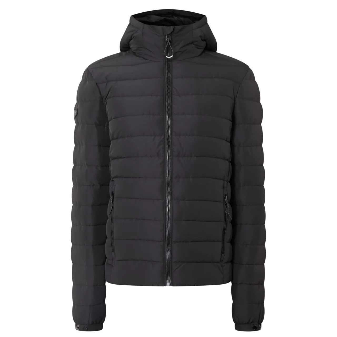 - Funnel neckline, hood with toggle adjustable fit, zip fastening, padded, long sleeves, elasticated cuffs with snap button adjustable fit, zipped side entry pockets, logo badge at sleeve