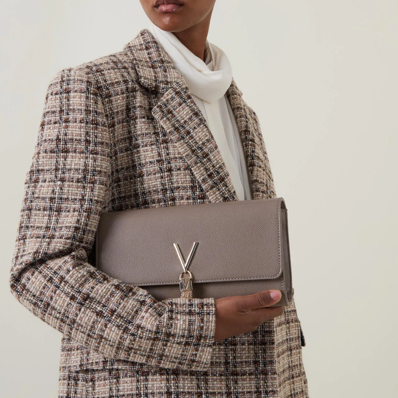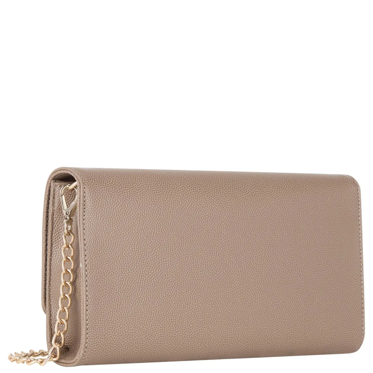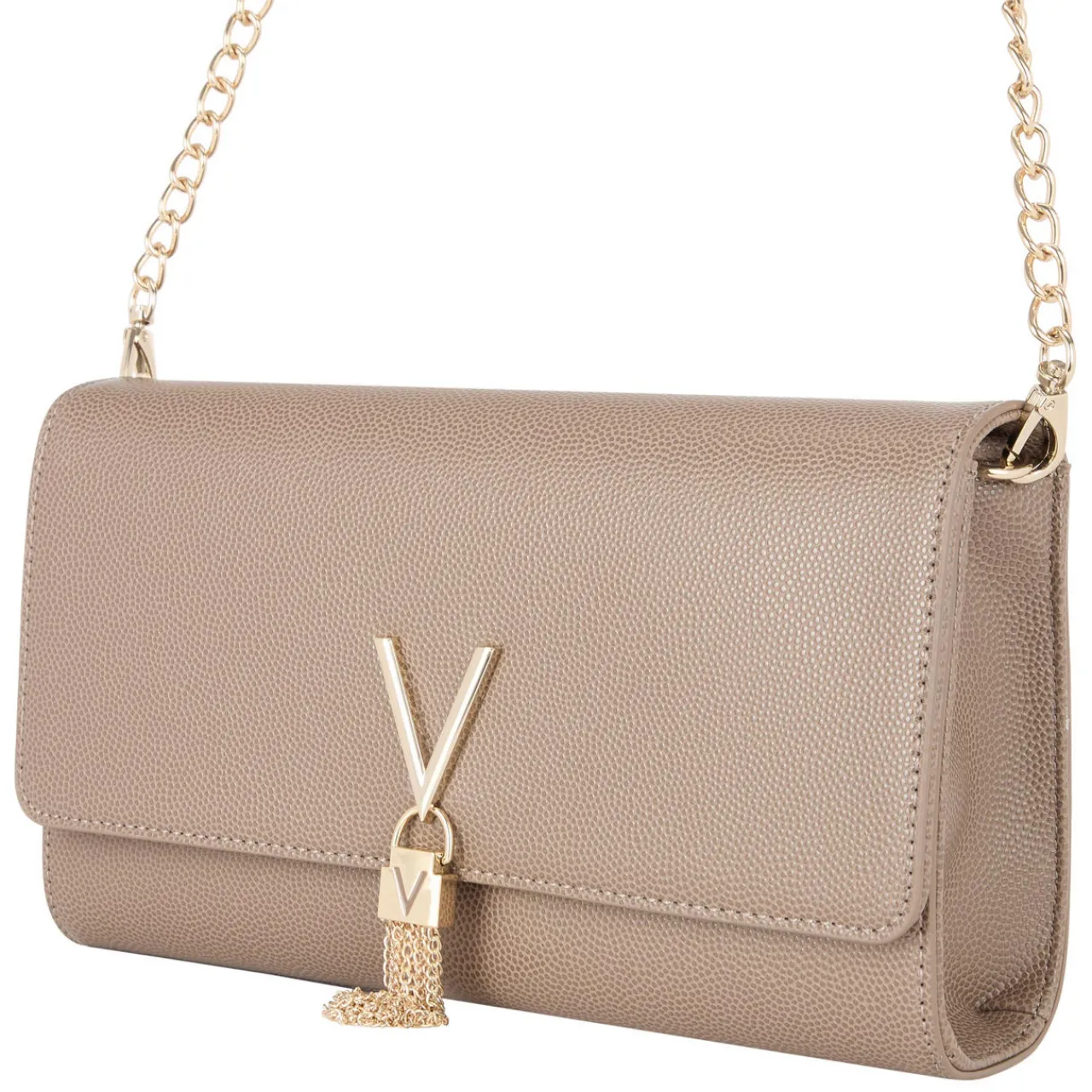 - Flap closure with snap button fastening, detachable chain strap, gold-tone hardware, V logo, tonal stitching, grained finish