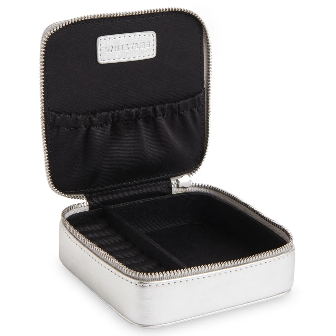 - Square silhouette, metallic finish, zip fastening, silver-tone hardware, brand logo details, travel style